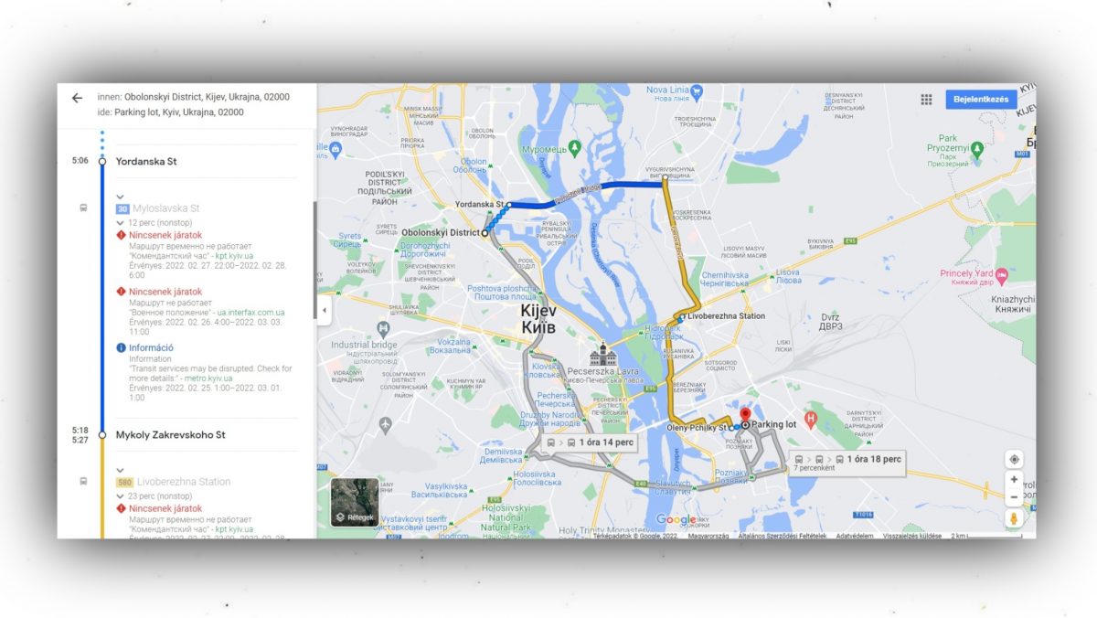 Ha Kijeven belül keresünk rá a tömegközlekedési lehetőségekre, akkor sem kapunk figyelmeztetést arról, hogy a városban általános kijárási tilalom van érvényben, ugyanakkor a térkép arra már figyelmeztet, hogy a tömegközlekedési eszközök jelenleg nem üzemelnek.