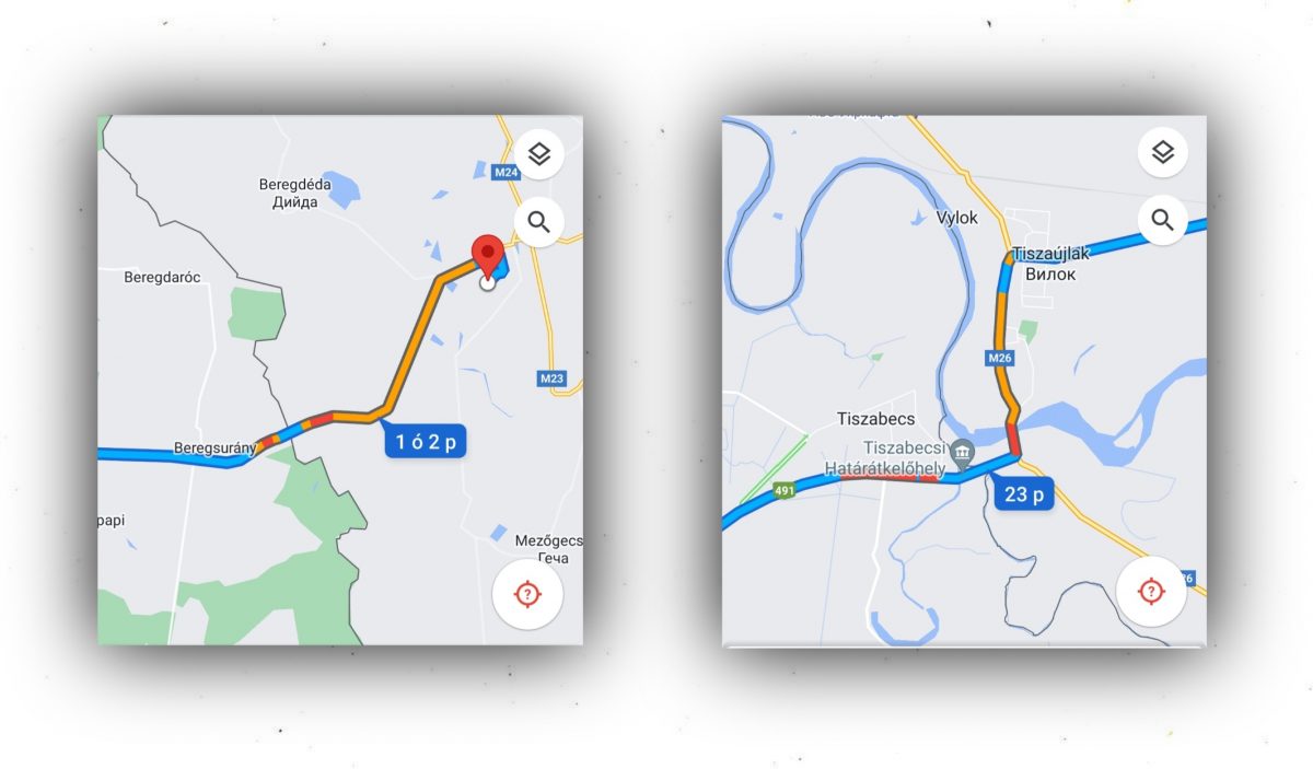 Az útlezárásokon és a tömegközlekedési eszközök menetrendjén kívül az ukrán krízis más módon is tetten érhető a Google térképén, mégpedig akkor, ha a határátkelőhelyekre keresünk rá. Bár a határátkelőknél éjszaka sem ritkák a kisebb-nagyobb torlódások, jelenleg a tiszabecsi és a beregsurányi határátkelőhelyre rákeresve is az látható, hogy az ukrán oldalon még éjjel 2 körül is feltűnően hosszú torlódást jelez a Google Térkép, ami egybevág azokkal a hírekkel, hogy ezeknél a településeknél több kilométeres sorok alakultak ki a háború elől Magyarország felé induló menekültek autóiból.