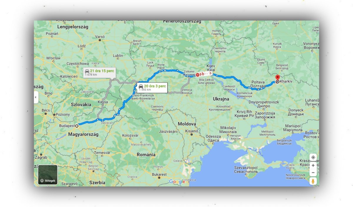 A Google Térképén egyelőre valóban csak apróbb jelekből lehet arra következtetni, hogy Ukrajnában háború zajlik. Ha a Budapest-Kijev-Harkov útvonalra keresünk rá, a térkép nem jelzi, hogy háború sújtotta területen készülünk áthaladni, ugyanakkor mind Kijev, mind pedig a célállomás környékén számos útlezárást jelez.