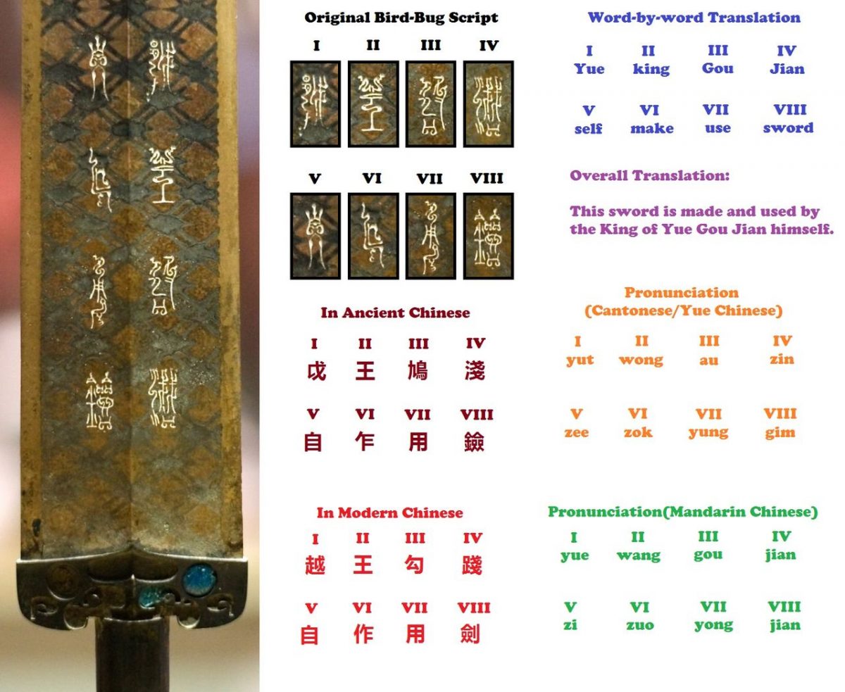 A penge egyik oldalán két oszlopban látható szöveg. Nyolc karakter van ráírva egy ősi írásformában, amelyet ma “Madár-féreg pecsét írásnak” hívunk (szó szerinti fordításban "madarak és féreg jelek," a meghatározó vonások bonyolult díszítésének köszönhetően), amely a “Pecsét írás” egy változata. A szöveg elemzése hat karaktert azonosított, melyek a „Yue királya” (越王) és „ezt a kardot személyes használatra készítette” (自 作用 劍) jelentéseket fedték fel. A fennmaradó két karakter feltételezhetően Yue királyának személyneve.