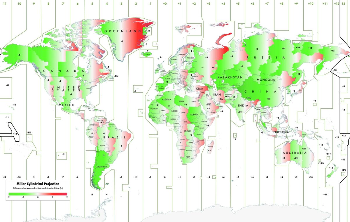 A helyzet Magyarországon nem ilyen durva, de hogy nálunk is „túl keveset” mutat az óra a valósághoz képest, az a következő térképen figyelhető jól meg. Az alábbi ábra fehér részein – egyszerűen fogalmazva – a hivatalos idő mondhatni összhangban van a nap járásával (Egyesült Királyság; Ausztria, Csehország, Szlovénia; Moldova stb.), a zöld területeken mért óra viszont a nap járásánál előrébb jár (Izland; Franciaország, Spanyolország, Hollandia, Belgium; Fehéroroszország stb.), a piros területeken pedig lemarad tőle – Magyarország is az utóbbiak közé tartozik.