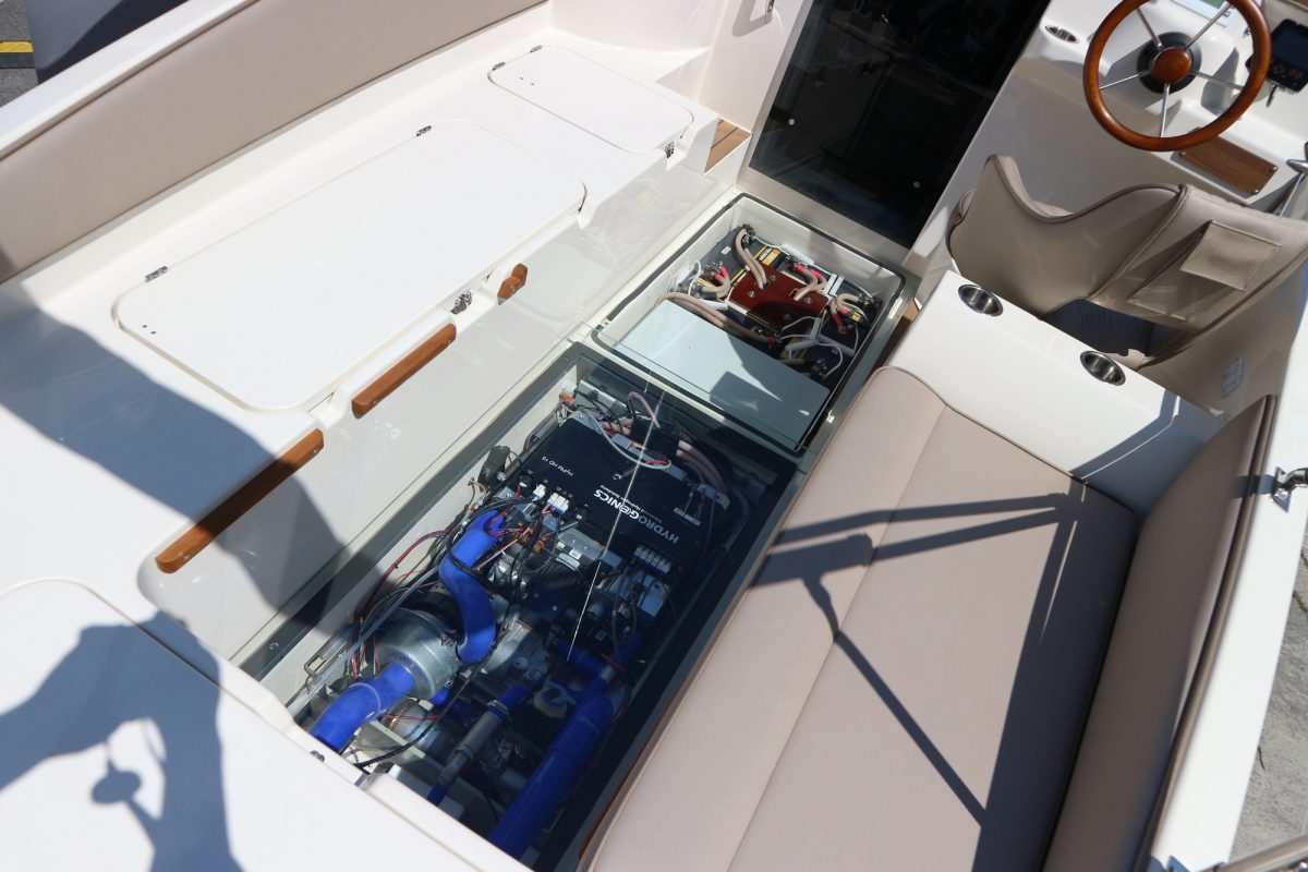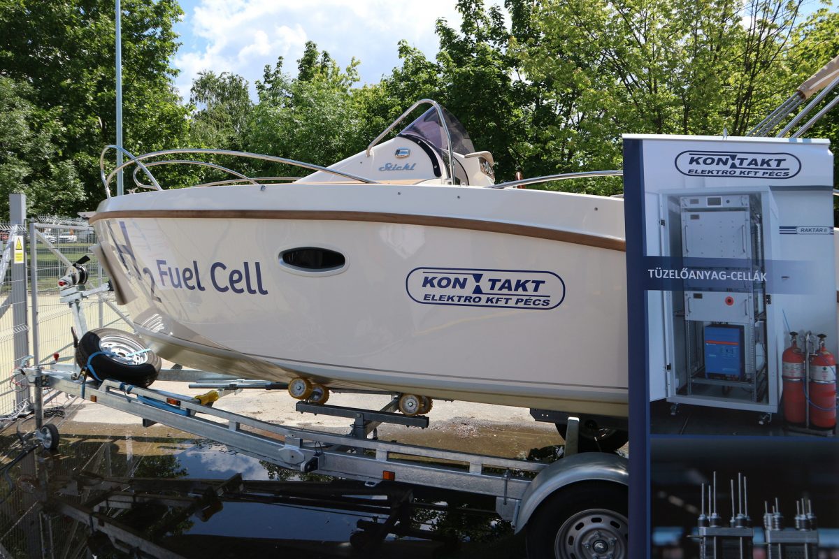 A hidrogénkút és a hidrogénautó bemutatóján még egy hidrogénüzemű járművet kiállítottak: egy hajót, amit a pécsi Kontakt-Elektro Kft., az üzemanyagcellákkal már bő évtizede foglalkozó magyar középvállalkozás szerelt össze. A kishajó 25 kW-os üzemanyagcelláját az ülések alatt elhelyezett hidrogéntartályok táplálják, az elektromos energiát pedig átmenetileg egy 74 kWh-s akkumulátorcsomag tárolja. A hajó prototípus, értéke mintegy negyvenmillió forint, de a gyártó nagyon szeretné, ha a csendes, emissziómentes, gyors újratankolást lehetővé tévő hajózás a közeljövőben reális lehetőséggé válna a magáncélú kishajózásban, de akár a balatoni kompforgalomban is!