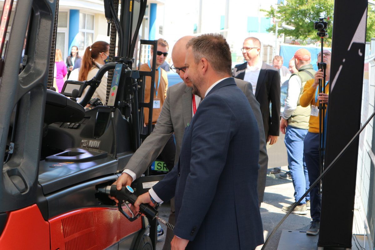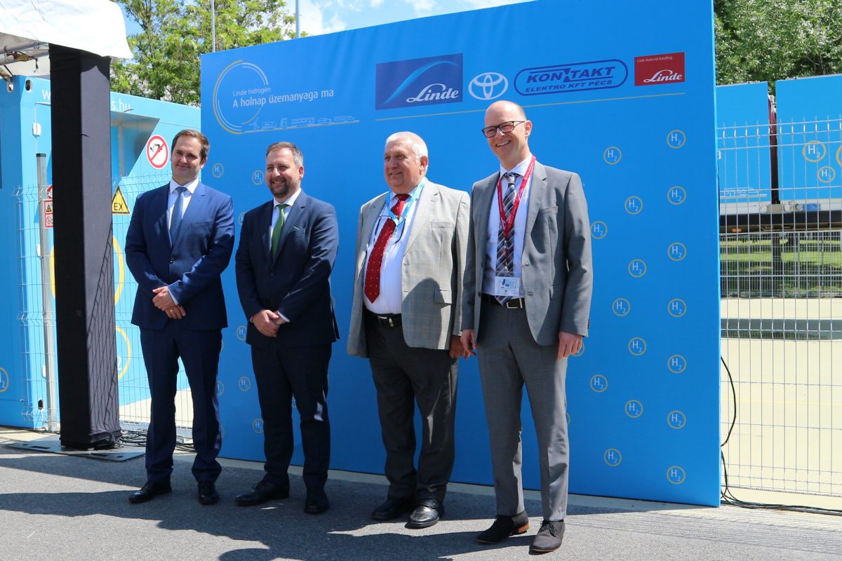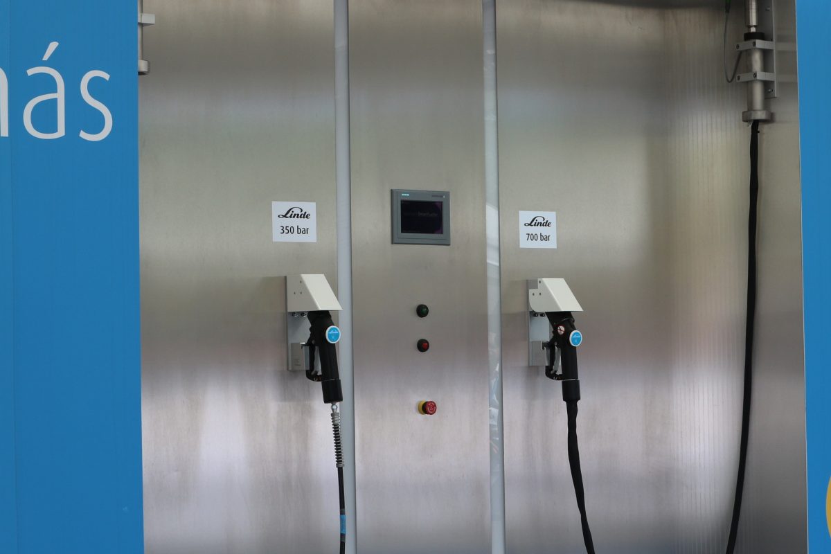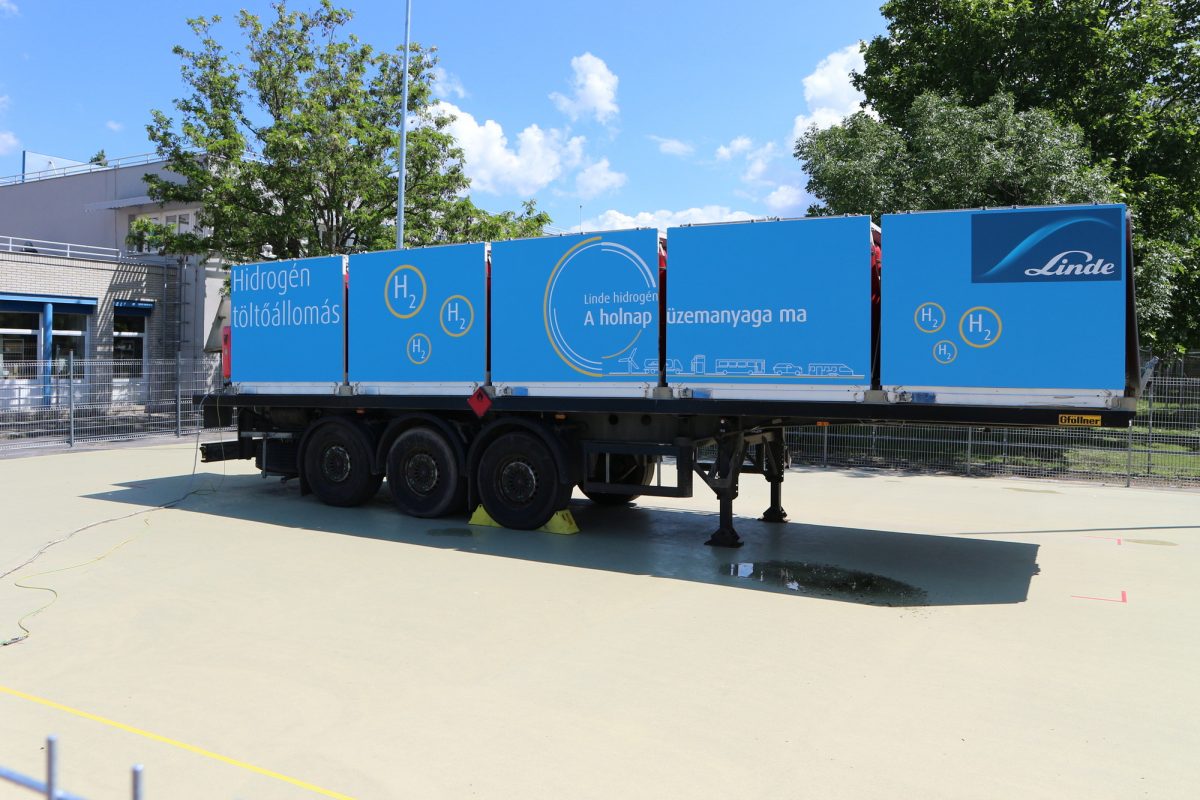 A Linde gázipari óriáscég Illatos úti telephelyén, kordonok mögött áll egy kamion-félpótkocsi, rajta néhány tucat piros gáztartály. A pótkocsitól egy vékony tömlő és egy vezeték tekereg a földön egy tőle pár méterre lévő nagy, kék konténerig. A konténer kordonon kívül eső oldalán lóg két, furcsa töltőpisztolyban végződő vastag fekete cső. Az egyik mellé azt írták: 350, a másik mellé: 700 bar. Ez az installáció Magyarország első hidrogén-töltőállomása.