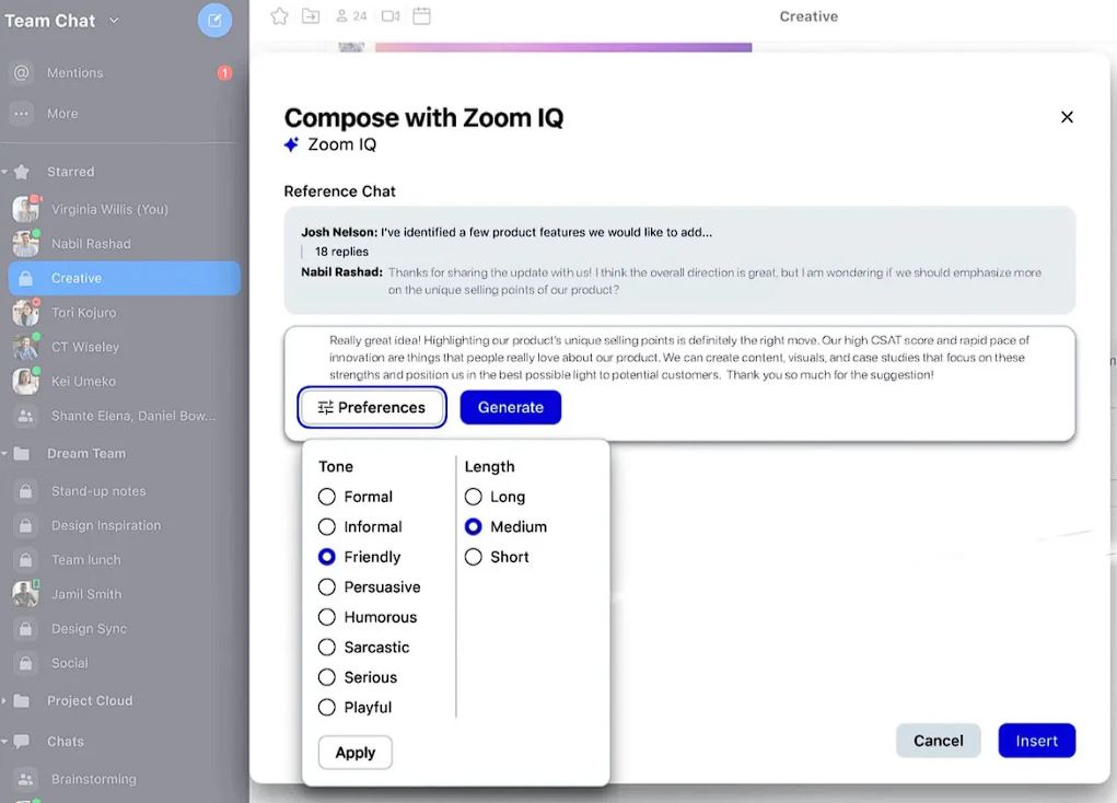 Ezenkívül a Zoom IQ számos más dolgot is meg tud majd tenni, például összefoglalja az értekezleteket és az azonnali üzenetekből álló beszélgetéseket a Zoom Team Chatben, illetve válaszokat is tud generálni kollégáinknak az MI segítségével. A vállalat bejelentése szerint áprilisban egyelőre csak egy szűkebb felhasználói körnek teszi elérhetővé a mesterséges intelligenciával létrehozott üzenet- és email-piszkozat lehetőségét, az értekezletet automatikusan összefoglaló funkció azonban szélesebb körben is használható lesz.