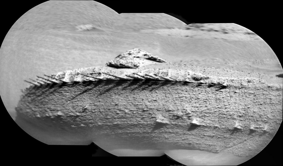 A fotó a Curiosity áprilisi tréfájának is tűnhetne (de nem az), mert a marsjáró a képet földi idő szerint április elsején készítette. Ami miatt a fosszilis gerincoszlop, mint ötlet felmerülhet, hogy a sziklán látható, egymástól egyenlő távolságra elhelyezkedő tüskék nagyban emlékeztetnek a csigolyák jellegzetes nyúlványaira. Ha mindez valóban egy csont maradványa lenne, úgy a felfedezés igen szenzációsnak számítana – nem csak a marsi élet nyerne így megerősítést, de az is, hogy a vörös bolygón egykor gerincesek is éltek.