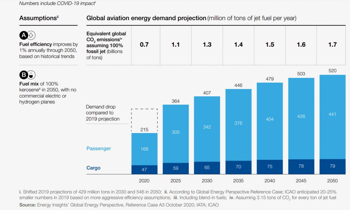A repülés sajátossága, hogy nagy értékű, hosszú élettartamú eszközöket használ; egy repülőgép 25 évig vagy még tovább is szolgálatban áll. A mai új gépek egy része elvileg még akkor is repülhet, amikor már elértük a CO2-semlegesség kitűzött céldátumát, ami az EU-ban 2050. A hagyományos technológia fejlődése valamennyire növeli a hajtóművek hatékonyságát, csökkenti a tömegarányos CO2-kibocsátást, de ha nem történne változás és a repülés továbbra is a kerozin felhasználására alapozna, 2050-re nemhogy nulla szén-dioxid-kibocsátással, hanem a tavalyi, COVID előtti értékek 1,7-szeresével számolhatnánk a gazdasági előjelzések szerint: