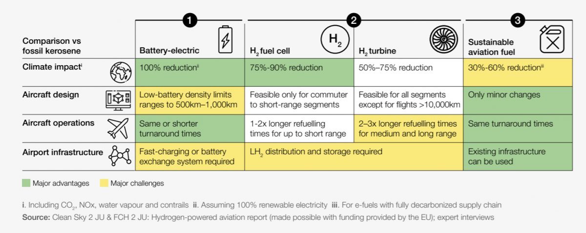 A fenti ábra négy lehetséges fejlesztés előnyeit és műszaki-gazdasági problémáit összegzi. Eszerint az akkumulátoros elektromos repülőgépekkel ugyan 100%-ban csökkenthető lenne a CO2-emisszió (amennyiben az energia megújuló forrásokból vagy nukleáris energiából származik, persze), viszont a nagy tömegű akkumulátorok használata legfeljebb rövid távokra jelenthet megoldást a repülésben és persze ki kell fejleszteni ezeket a ma még nem létező gépeket. A hidrogéncellás repülés komoly infrastrukturális fejlesztéseket és szintén teljesen új gépek megtervezését, gyártását igényli 75-90%-os klimatikus hatáscsökkentés mellett. Ezek a gépek is csak a rövidebb utakra lennének használhatók. Ha olyan repülőket használnánk, amelyek jet-hajtóműben égetnék el a hidrogént, hosszú hatótávú repülésekre nyílna lehetőség a jelenlegi klimatikus hatások fele-háromnegyede mellett. A biokerozin vagy megújuló forrásból származó jet-üzemanyag pedig minimális műszaki átalakításokat és infrastrukturális beruházást igényel ugyan, de a klimatikus hatásokat csak 30-60%-kal lehetne mérsékelni a teljes átállás esetén.