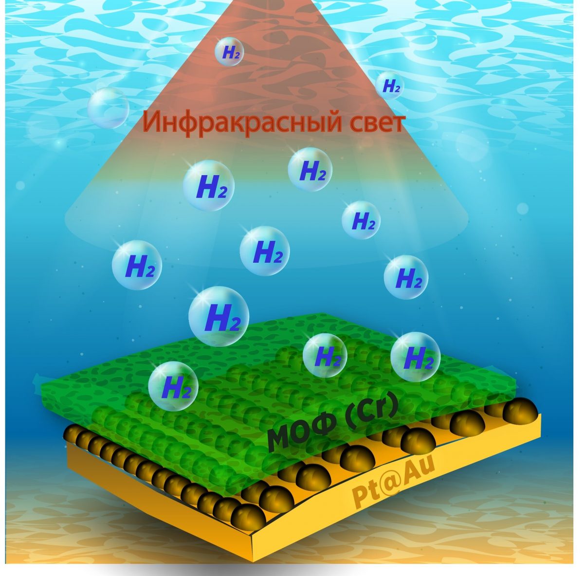 A komponens hidrogénmolekulákat generál sóból és szennyvízből, a katalizátor pedig a közvetlen napfény. A kísérletet az ACS Applied Materials & Interface oldal tette közzé. "Mivel a hidrogén alternatív energiaforrásnak számít, a hidrogéntechnológiák fejlesztése megoldást jelenthet a globális energiaválságra." - mondja Olga Guselnikova, a tanulmány egyik szerzője, a TPU Kémia és Alkalmazott Orvosbiológiai Tudományok Kutatóintézetének munkatársa. Ugyanakkor hozzátette, hogy a sikeres alkalmazásig még meg kell oldaniuk néhány felmerülő problémát. Egyrészről a világ tudósai napjainkban is folyamatosan keresik a hidrogénelőállítás környezetbarát módszereit. Az eddig ismertek közül az egyik legelterjedtebb a víz szétbontása napfény segítségével. Bár sok víz van a bolygónkon, de csak néhány gyakorlat alkalmas a só vagy a szennyezett víz hasznosítására. "Ezenkívül csak kevesen használják az infravörös spektrumot, amely az összes napfény negyvenhárom százalékát adja." - teszi hozzá a kutató. A kifejlesztett anyag háromrétegű és egy mikrométer vastagságú: a legalsó réteg egy vékony aranyfólia, a második tíz nanométer platina, a harmadik pedig krómvegyületek és szerves molekulák fém-szerves alkotóelemei. A kísérletek során Guselinkova és munkatársai átitatták vízzel az anyagot, ezután tartályba tették, amit le is zártak azért, hogy időszakos gázmintákat vehessenek a hidrogén mennyiségének meghatározására. Kiderült, hogy az infravörös fény okozta a plazmonrezonancia gerjesztését a minta felületén. Az aranyfólián generált forró elektronokat áthelyezték a platinarétegre, ezek az elektronok pedig megindították a protonok redukcióját a szerves réteg felületén. "Ha az elektronok elérték a fém-szerves vázak katalitikus központját, akkor az utóbbiakat protonok redukálására és hidrogén előállítására is felhasználtuk" - magyarázza Guselinkova. Az alábbi fotón az anyagról készült illusztrációt láthatjuk, miközben előállítja a hidrogént.