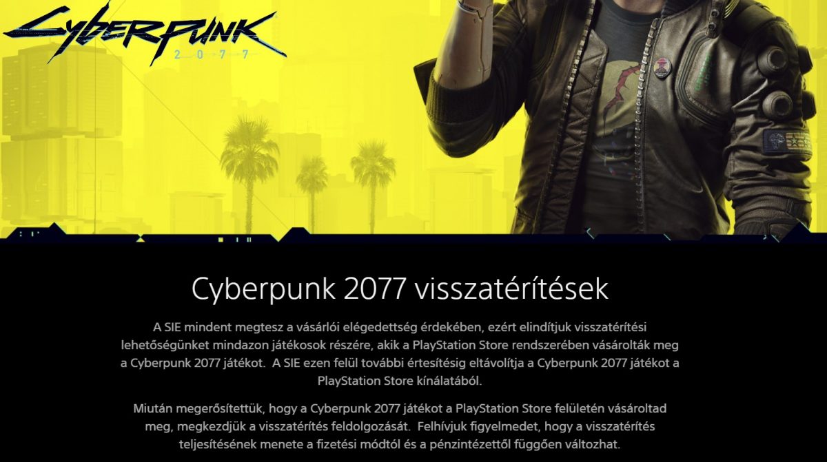 Frissítés #1: A történet mozgásban van, és a legújabb fejlemény, hogy a Sony ma, 2020 december 18-án bejelentette, hogy törlik a játékot a kínálatukból további értesítésig, és teljes kompenzációt ajánlottak fel mindenkinek, aki azt a digitális boltjukon (PlayStation Store) keresztül megvásárolta. Persze ha valaki szeretné, megtarthatja a saját digitális példányát, ez elérhető marad továbbra is. A döntés a játék fizikai forgalmazását nem érinti. Hozzá kell tenni, hogy ez egy ekkora játék esetén példátlan lépés, kisebb címeknél már fodult elő ugyan hasonló, de nagy AAA játéknál emberemlékezet óta nem. Maga a visszaváltás nagyon egyszerű, a fentebbi címen elérhető a refund chatbot opció, és jelenleg a chatbot egyből rákérdez, hogy a Cyberpunk 2077 esetén igényeljük-e a visszatérítést, amennyiben igen, ezután csak egy gombot kell megnyomnunk. Ezt követően a lenti üzenet olvasható: