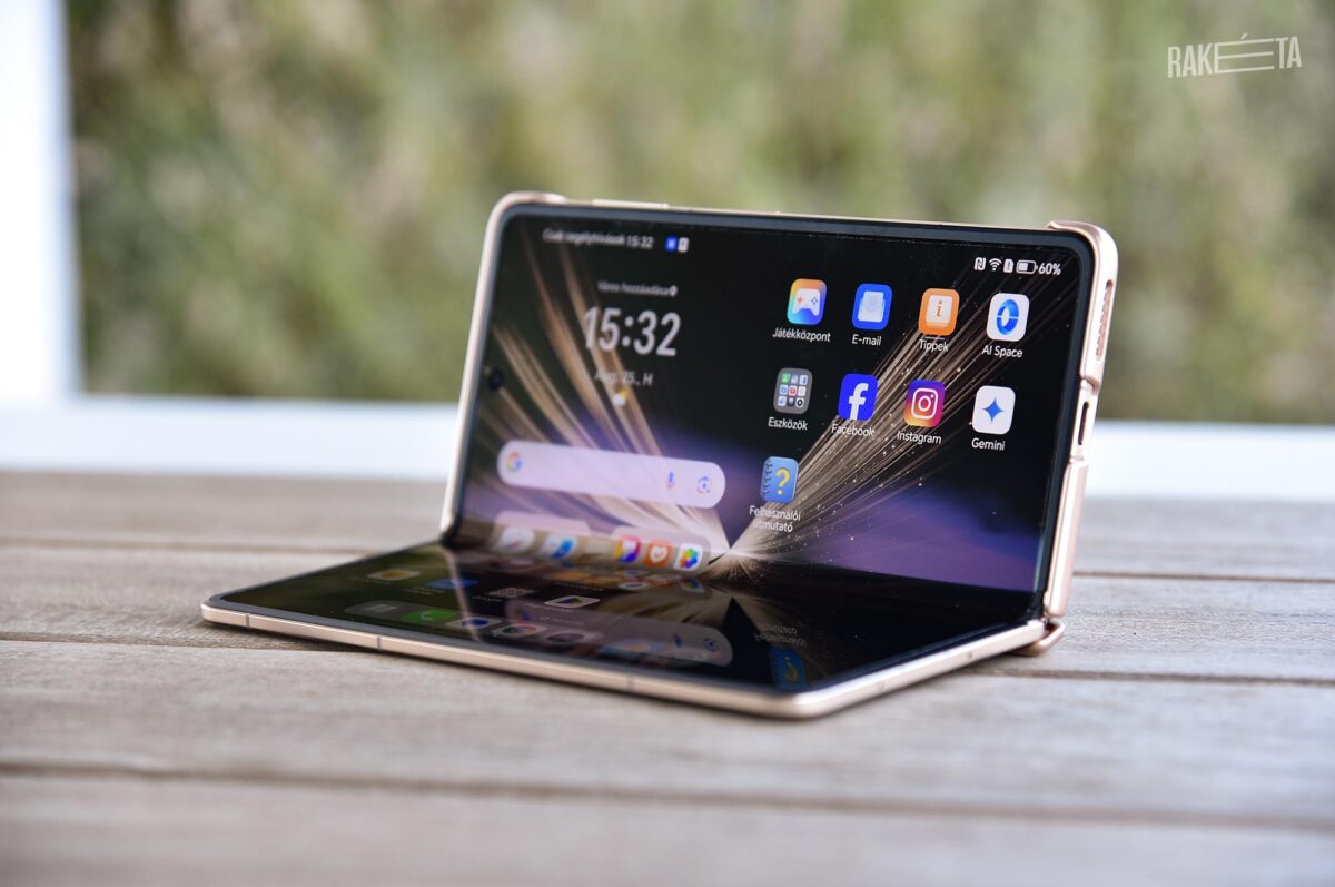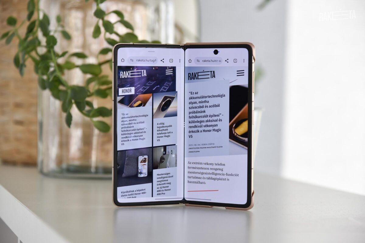 és a kamera használata közben, vagyis képek, videók felvételénél is nagy szolgálatot tehet, mivel a nagy kijelzőn sokkal jobban el tudjuk végezni a beállításokat. Mindezekre a jó tulajdonságokra azonban árnyékot vethet, ha az élményért cserébe egy nehéz, idomtalan készüléket kell a zsebünkbe gyömöszölnünk, mikor nem használjuk. Tapasztalataink alapján a Honor Magic V5-tel egyáltalán nem merülnek fel ilyen dilemmák: a hajszálnyival vastagabb, 9 mm-es verzió is olyan kényelmesen dugható zsebre, mintha egy nem-hajlítható telefon lenne, és igen könnyű is 217 grammos súlyával. Egyetlen kritikaként a kiugró kameramodul nagyságát tudjuk csak említeni, ami azért ront egy kicsit az összképen, és ami miatt az asztalra helyezett, teljesen kinyitott mobil elég rendesen billeg, ha gépelünk rajta.