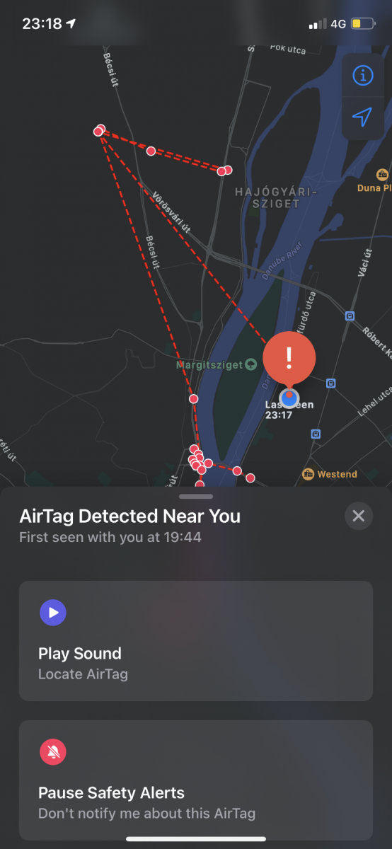 Autóztam a városban, amikor elkezdett csipogni valami. A jellegzetes ritmus alapján - néhány perc bamba gondolkodás után - rájöttem, hogy egy AirTag lesz az, bár eleinte azt hittem, hogy a kulcsomon, vagy a tárcámban lévő őrült meg. Aztán nem sokkal később egy figyelmeztetés is megjelent az iPhone-omon: "Találtunk egy AirTaget, ami veled mozog. A helyzetét láthatja a tulajdonosa.". Ekkor lett gyanús a történet, így a Lokátor appba belépve elkezdtem csipogtatni a rejtélyes nyomkövetőt. Némi keresgélés után megtaláltam a kocsi csomagtartójában - a feleségem táskájában, a kulcsán. Vagyis a véletlenül az autóban felejtett kulcscsomó egy pillanat alatt házastárs-figyelővé változott, ám ezt az iOS mostmár észrevette és jelezte. A Lokátorban még azt is láthattam, hogy pontosan merre jártam, míg a feleségem "megfigyelt", bár azt nem közölte az app, hogy pontosan kié az AirTag. Ennek megfelelően, ha AirTag csipogást hallunk a környezetünkben, érdemes elkezdeni keresgélni. Szerencsés esetben megtaláltuk valakinek a kulcsát, még szerencsésebb esetben meg tudjuk akadályozni, hogy megfigyeljenek.