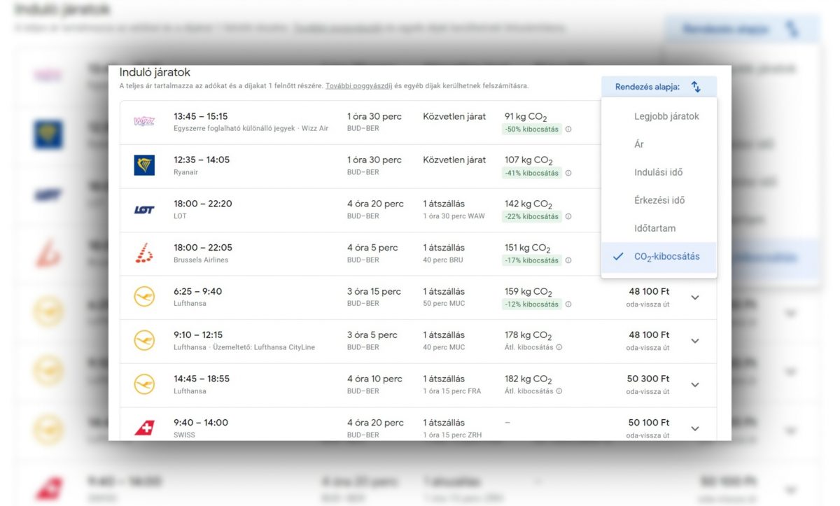 A keresőóriás egy blogbejegyzésben jelentette be, hogy új funkcióval bővült a Járatkereső szolgáltatása, amelyben mostantól ha rákeresünk egy célállomásra, azt is láthatjuk, hogy melyik repülőjárat mennyi szén-dioxidot bocsát ki utasonként az út során. A listázott járatokat rendezhetjük is a kibocsátásuk szerint, ehhez a lista mellett megjelenő "rendezés alapja" gombra kell kattintanunk, és ott kiválasztani a "CO2-kibocsátás" opciót.