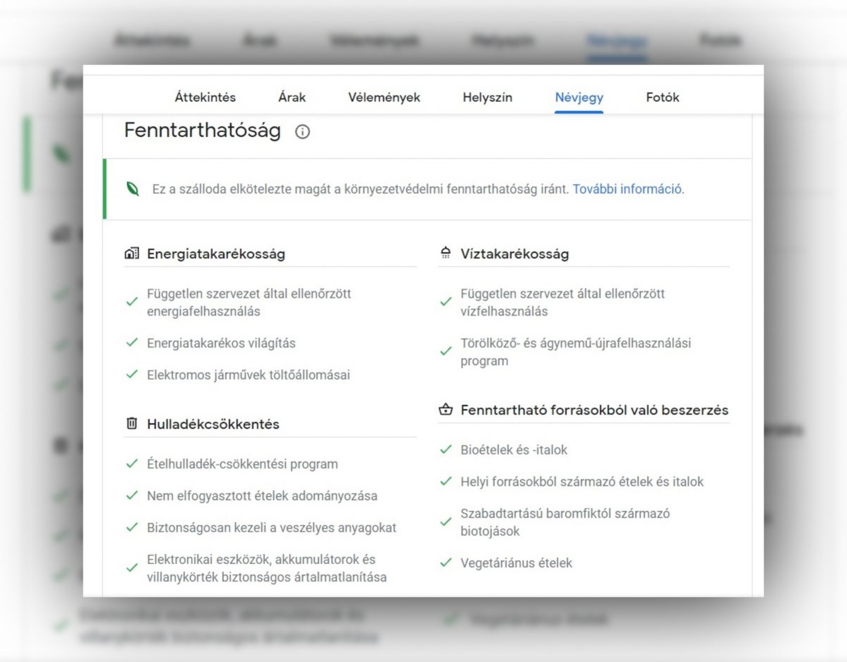 A Google-nek nem ez az egyetlen olyan kezdeményezése az utóbbi időben, amivel igyekeznek támogatni a fenntarthatóbb turizmust, nemrég például egy olyan funkciót is bevezettek, amellyel kifejezetten fenntartható szállodákat kereshetünk magunknak. Ha a Google keresőben rákeresünk egy szállodára, akkor a névjegynél lefelé görgetve találhatjuk meg a "Fenntarthatóság" rovatot, amelyben alkategóriák szerint informálódhatunk arról, hogy az adott szállás milyen lépéseket tett az energiatakarékosság, a hulladékcsökkentés, a víztakarékosság, és a fenntartható forrásokból való beszerzés jegyében. A feltüntetett információk nem önbevalláson alapulnak, az ökotanúsítványt a szállodák olyan akkreditált, független szervezetektől kaphatják meg, mint a Green Key vagy az EarthCheck.