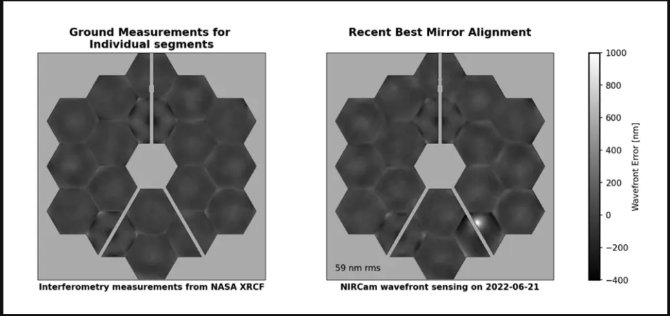 A fenti kép jobb alsó sarkában lévő C3 tükörben az ütközési hely egyetlen fényes fehér horpadásként jelenik meg, amely jól észrevehető a tükör arany felületén. A beszámoló szerint ez a horpadás tehát „javíthatatlan” (uncorrectable), de csak a tükör egy piciny részét érinti, amelynek egyébként úgy tűnik, hogy a teleszkóp teljesítményére sincsen hatása, mivel a teleszkóp teljesítménye majd' minden szempontból meghaladja a várakozásokat – a JWST által készített első képekről itt írtunk.