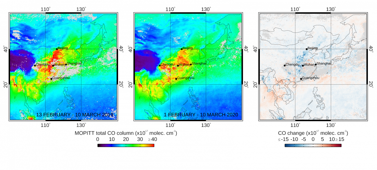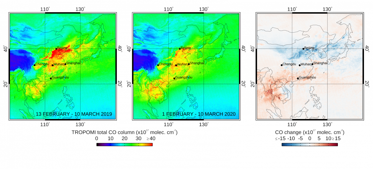 Az ázsiai adatokat az Atmospheric Chemistry Observation and Modeling (ACOM) munkatársai dolgozták fel, a szatellit felvételek szintén az Esa Copernicus Sentinel-5P Tropomi eszközétől valamint a NASA Terra egységétől származnak. Itt a troposzféra szén-monoxid szintjét figyelték meg Kína keleti régiója felett. A második képen a 2020 február elsejétől március 10.-ig tartó periódus látható, az elsőn 2019 februárja és márciusa közti időszak.