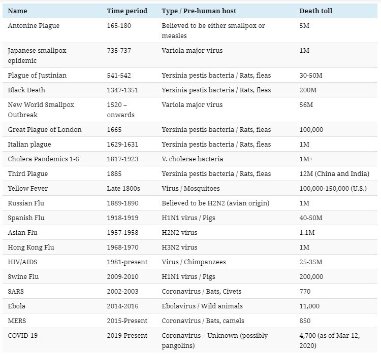 Mivel folyamatban lévő járványról van szó, aminek a kiterjedése és a súlyossága is nagyban függ attól, hogy az országok hogyan reagálnak rá, ezért természetesen egyelőre nem lehet objektíven összehasonlítani a Covid-19-et a korábbi járványokkal, a World Economic Forumon közölt infografika tehát ebből a szempontból inkább egy érdekességnek tekinthető.