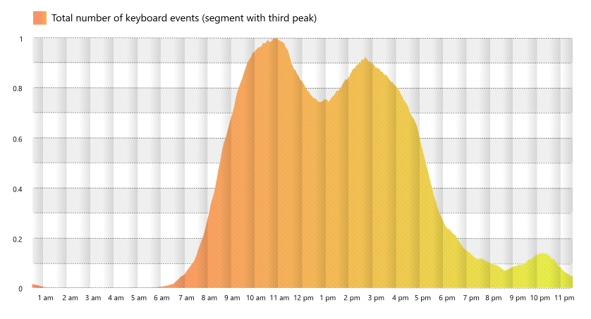 A Fast Company cikke szerint a világjárvány előtti munkarendben jellemzően délelőtt fél tizenegy körül, majd délután fél háromkor ütöttük le a legtöbb billentyűt, ezzel egy "kétpúpú" grafikont rajzolva a kutatások ábráiban. Most azonban egy ötvenfős, belső, vagyis semmiképp sem reprezentatív Microsoft kutatás arra jutott, hogy az alanyok harmadánál megfigyelhető egy harmadik púp is,