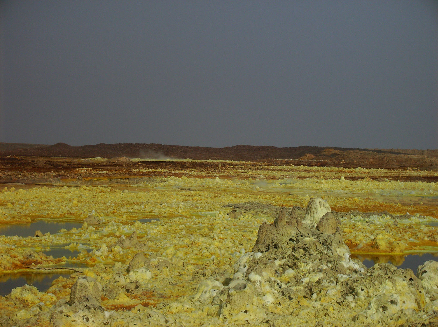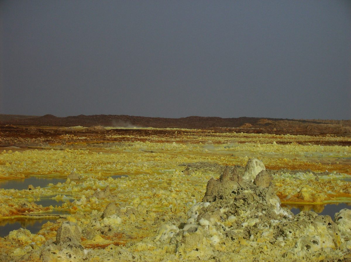 A Danakil etiópiai mélyedésében fekvő Dallol pokoli tája a vizes vulkanikus kráter felett terül el, ahol a földből mérgező gázok szivárognak, a víz pedig szimplán felforr az intenzív hidrotermikus tevékenység közepette. Ez a Föld felszínén található egyik legforróbb környezet. A téli napi hőmérséklet meghaladhatja a 45 Celsius fokot, gyakoriak a hipersós és hipersavas medencék, amelyek pH-értéke konkrétan a negatív tartományba esik.