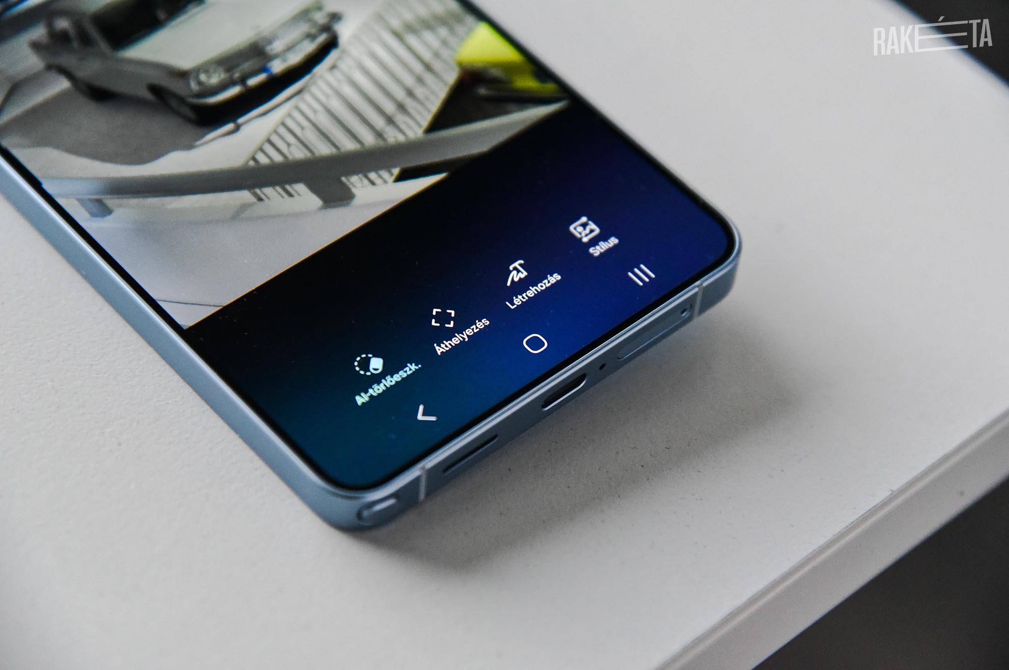 Az elkészült képeket tovább javíthatjuk a mesterséges intelligencia segítségével, és ezen a téren is sokat fejlődött a Samsung csúcsmodellje. Már nemcsak bekarikázással adhatjuk meg, hanem szövegesen, magyarul is elmondhatjuk, hogy mit szeretnénk változtatni a képeken. A fotósegéd ezzel képes eltávolítani a zavaró részeket, de akár nappalt csinál az éjszakából, vagy a galériából kiválasztott másik képet is rá tudja tenni a fotóra, a részletek és árnyékok igazításával. Az S-Pennel továbbra is rajzolhatunk a képre, amit valósághűen megalkot a rendszer, és a generatív mesterséges intelligenciával saját matricakészletet is alkothatunk, ami beépül a billentyűzetbe.