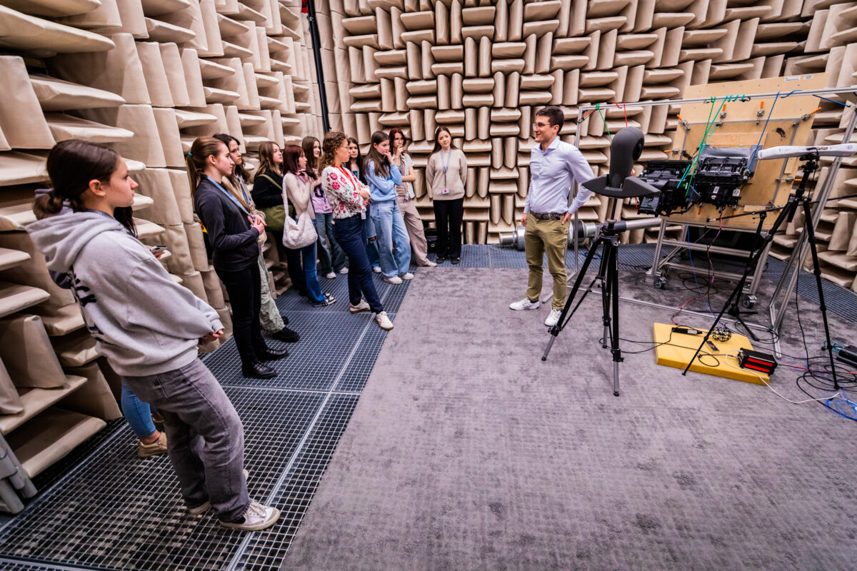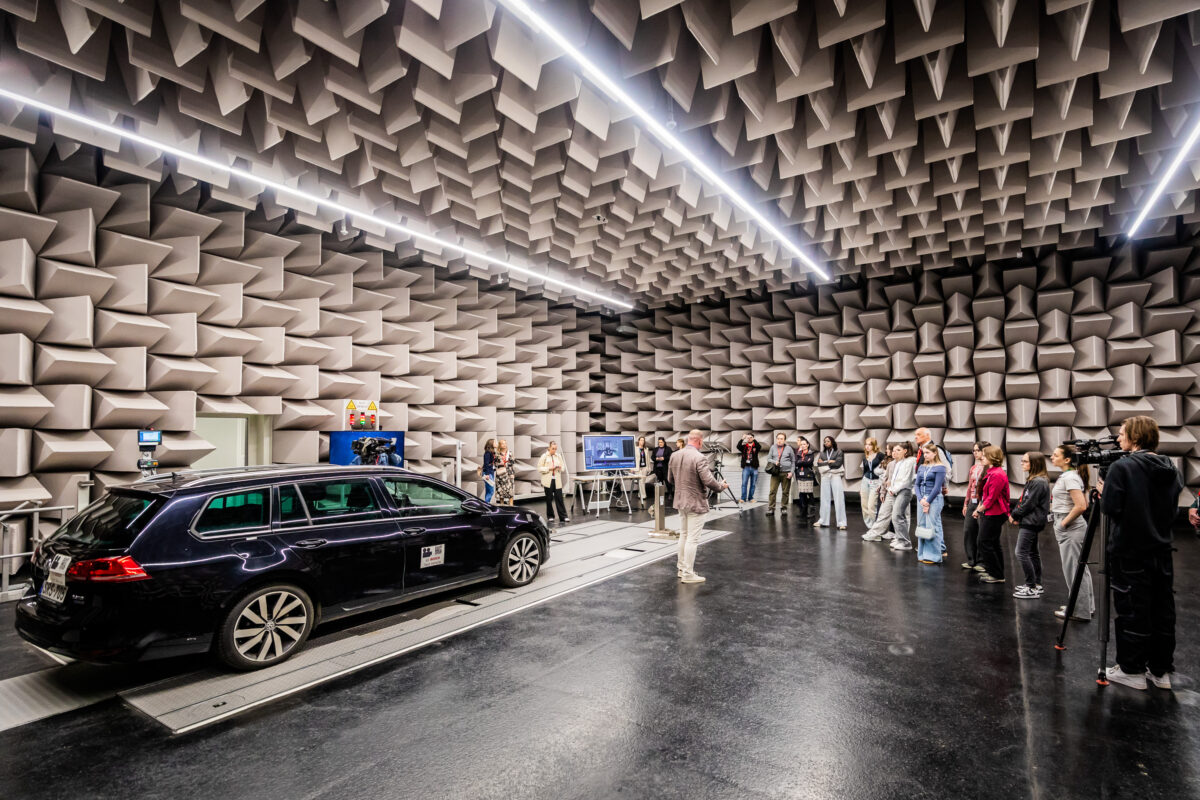 Az épületben többféle süketszobában tesztelik a járműveket, amelyek az akusztikus próbáknak köszönhetően válhatnak egyre csendesebbé, az itt szerzett adatok alapján tudják ugyanis optimalizálni a szakértők az egyes rendszerek, berendezések működését a hanghatások szempontjából. A speciális termekben a falakat és a mennyezetet körbeölelő borítás elnyeli a hangokat, és egy teljesen visszhangmentes környezetet hoz létre, így az akusztikus tesztelést zavartalanul végezhetik a mérnökök. Az innovációs kampuszon az autók különböző, valamennyi zajt generáló komponenseit, például az ablakemelőt, vagy az ablaktörlőt is tesztelik az autós kamrában - a munkafolyamatot a lányok is nyomon követhették, de nem csak az autók teszteléséről, hanem a vezetésével kapcsolatban is megtudhattak érdekes részleteket a rendezvényen.
