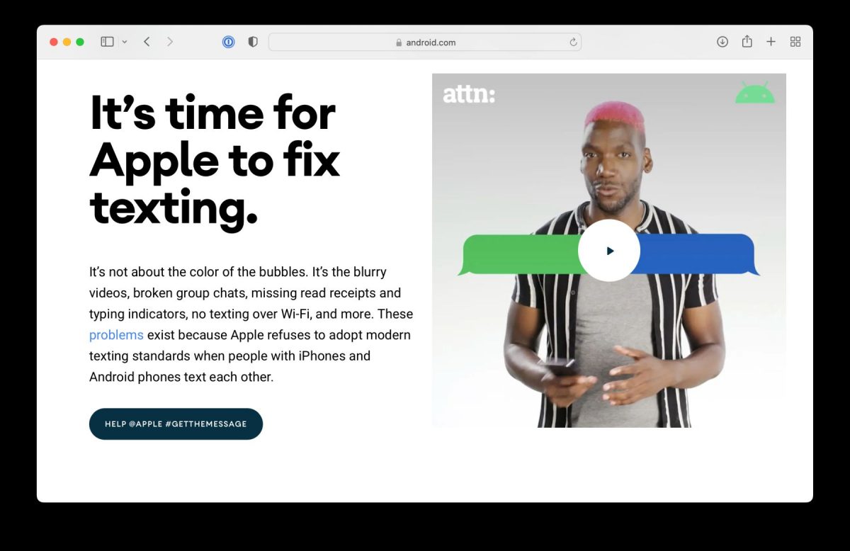 A Google nemrég úgy döntött, hogy a lobbizás helyett és mellett nyilvánosan is elkezd üzengetni Cupertinónak. Két hónapja, amikor Drake új albumán megjelent egy "Zöldre váltanak az SMS-ek" című szám, Twitteren rögtön odaszóltak az Apple mérnökeinek, hogy itt volna az ideje dolgozni a kérdésen. Augusztus elején egy teljes weboldalt szenteltek a kampányuknak, amelynek az üzenete egyértelmű: "Itt az ideje, hogy az Apple rendbe hozza az SMS-ezést".