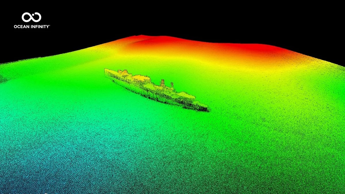(A három autonóm víz alatti jármű által készített képen jól látszik, hogy a roncs több mint 80 év alatt is meglepően jó állapotban maradt a tenger mélyén, forrás: Ocean Infinity)