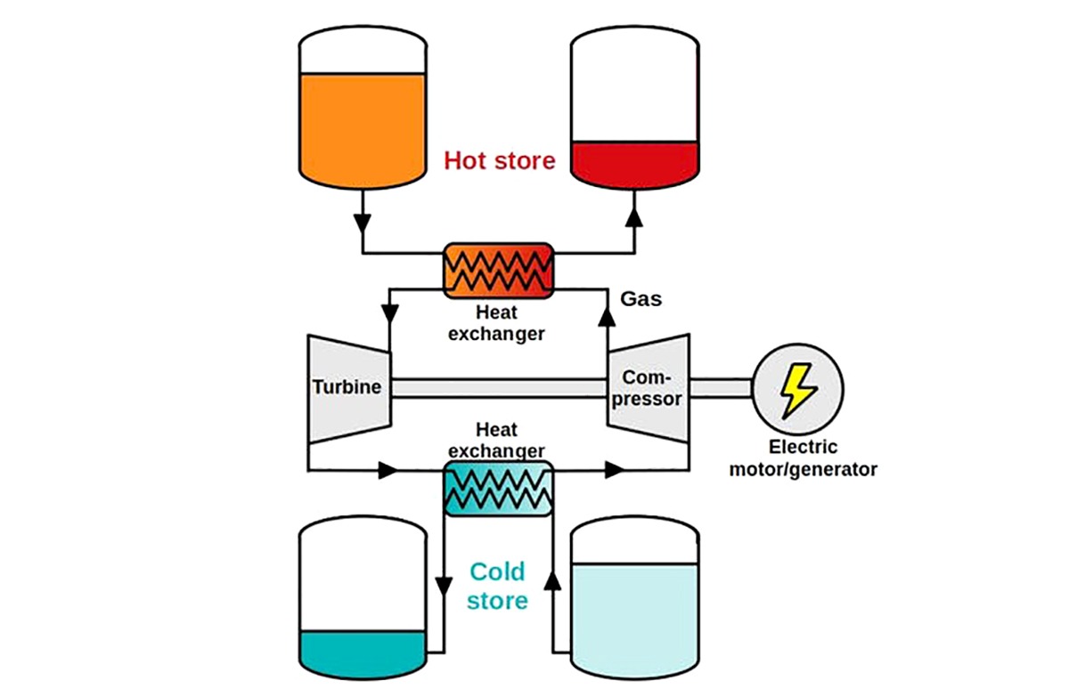Az elektromos áramot a közegben hőként tárolják, amíg szükség nem lesz rá, és akkor egy hőmotort használnak a hő árammá történő visszaalakítására. A rendszer a termodinamikai ciklusok elvét használja fel.