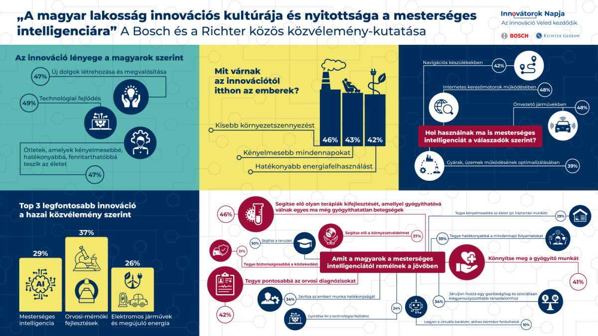 A két cégalapító vállalatai azóta is az élen járnak a működési területükkel kapcsolatos iparágakban és most először közösen rendezték meg a remények szerint hagyományt teremtő Bosch×Richter Innovátorok Napját (Egy asztalnál a mesterséges intelligenciával), ahol a két vállalat vezetői és számos vendég előadása mellett bemutatták a magyar lakosok körében végzett reprezentatív felmérés eredményeit is az innováció témájával kapcsolatban. Noha az innováció definícióját nehéz egészen pontosan meghatározni, annyi területet lefed és annyiféle meghatározása létezhet, de alapvetően a megszokottól eltérő újdonságot jelenti, ami valamilyen szempontból a fejlődéshez, például technológiai fejlődéshez járul hozzá.