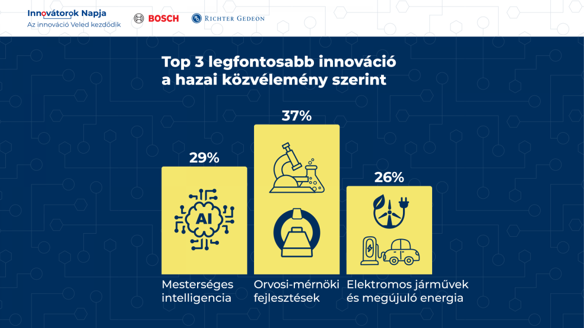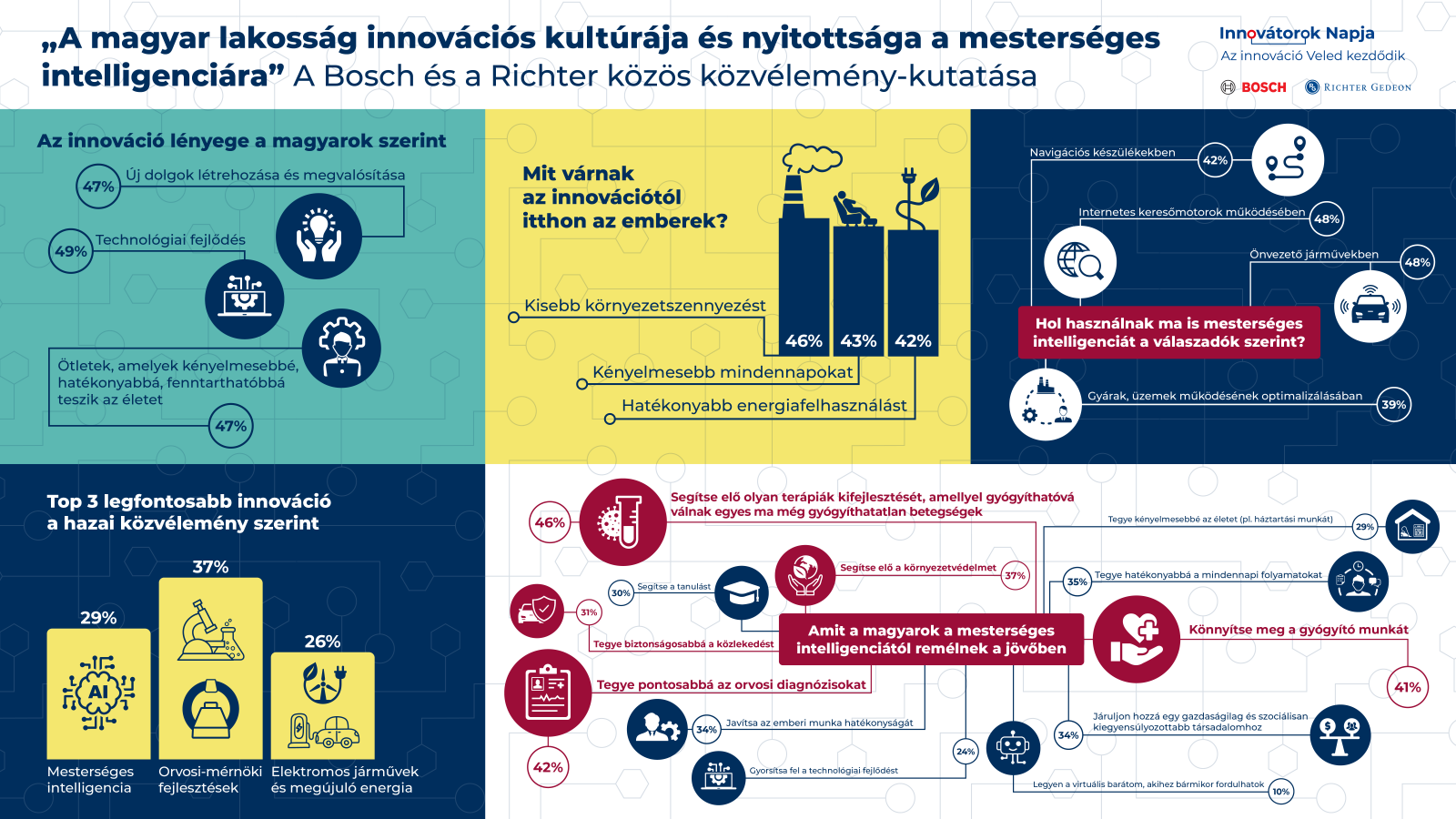 Vagyis a magyar lakosság alapvetően talán inkább pozitív irányt lát az MI-fejlesztésekben, mint ahogy más jellegű innovációkban is, amelyek ha néha rejtetten is, de behálózzák az életünket és sokszor anélkül is használjuk őket, hogy tudnánk róla vagy figyelnénk rájuk. A névadó innovátorokhoz illően a Bosch és a Richter cégek is az alapítójuk nyomdokain járnak és a kutatás-fejlesztésre hatalmas összegeket ruháznak be, ami meg is térül a termékekben. A Richter Közép-Európa legnagyobb gyógyszeripari K+F központjával rendelkezik és a mesterséges intelligencia alkalmazását egyre inkább előtérbe helyezi a kutatások során. 2020-ban egy, a kísérleti állatok mindennapi életének megzavarása nélkül alkalmazható ketrecet és a hozzá tartozó rendszert, az IntelliCage-et használták a kognitív és viselkedési tesztekhez, valamint gépi tanulási alkalmazásokkal tették hatékonyabbá a modellezési fázist.