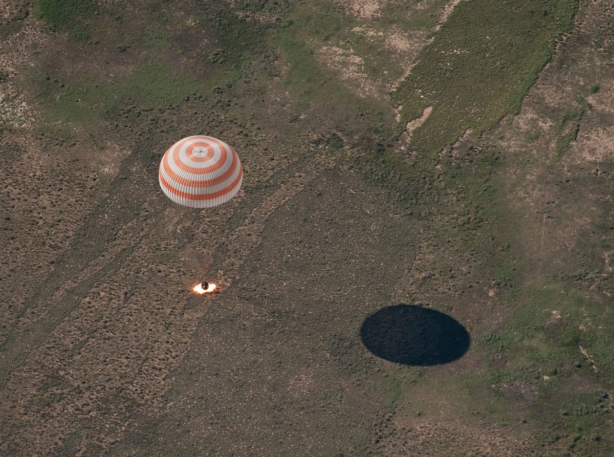 Az űrhajósokat ezalatt egy hővédő pajzs védi, amely a föld felé néz, ahogy a kapszula ereszkedik. Nem sokkal ezután több ejtőernyő nyílik ki és a leszállómotorok is bekapcsolnak, amivel a jármű óránként körülbelül 5 kilométer/órás sebességre lassul, mielőtt landolna valahol Kazahsztán sztyeppéin.