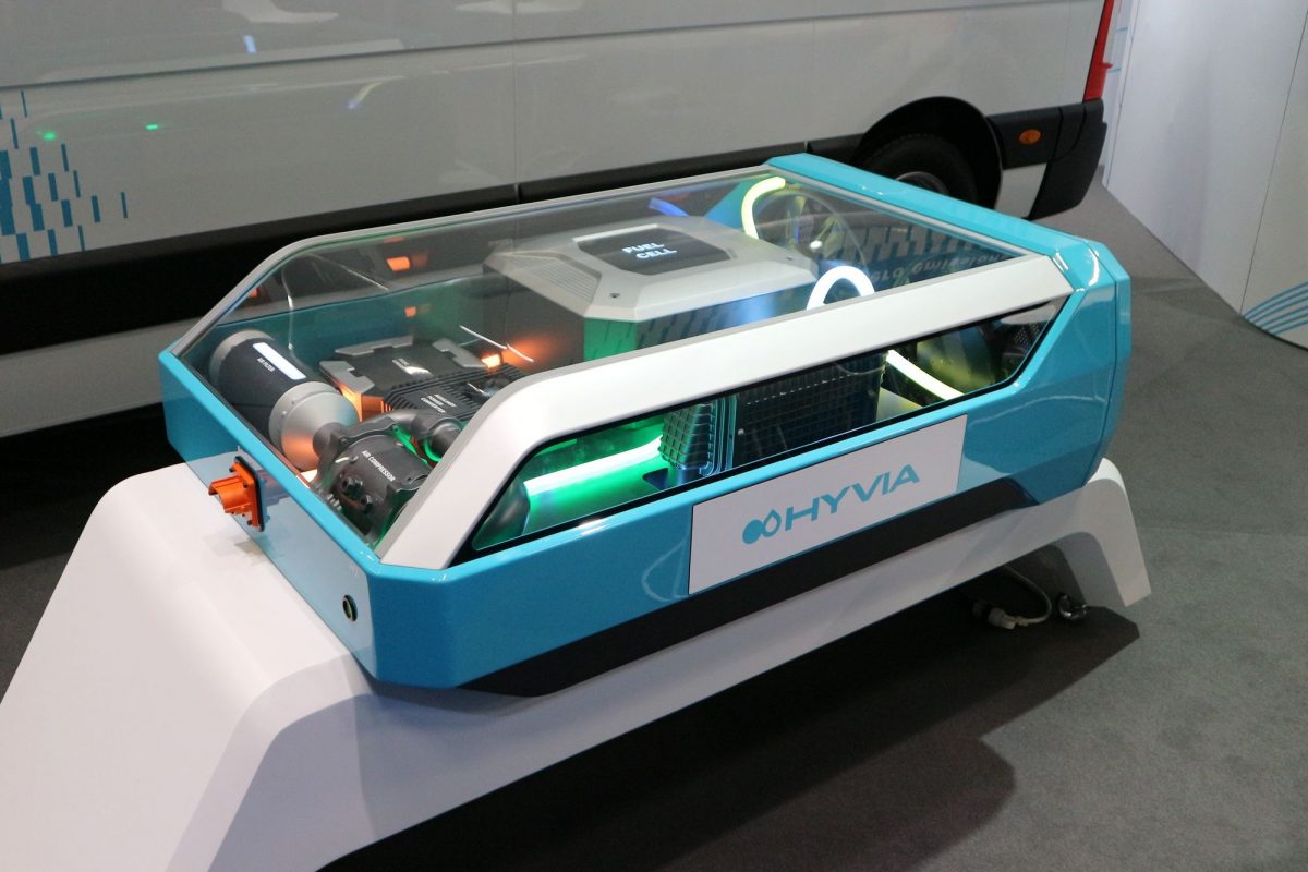 A fenti képeken a Hyvia és a Renault hidrogéncellás Master furgonja látható, ebben ugyanaz a technológia dolgozik, mint a Toyota Mirai-ban, amivel Rotterdamba autóztunk. A hidrogénből és a levegő oxigénjéből csendben, káros anyag keletkezése nélkül elektromos energiát fejlesztő cella (a kék dobozban) elfér a motortérben, a tartályokat fel lehet tenni a kocsi tetejére: a Master praktikuma nem sérült az átalakítással.
