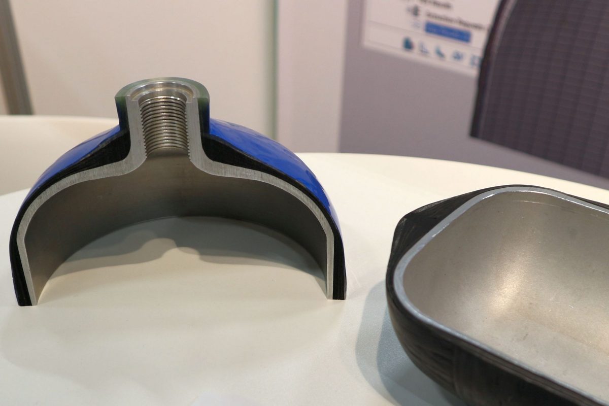 Alumínium-üvegszálas-szénszálerősítéses műanyag kompozit tartályból annyi volt az expón, mint a szemét. Számtalan gyártó demonstrálta kész termékekkel, hogy a picurka hidrogénmolekulák kidiffundálása a palackból már nem valós gyakorlati probléma és a tartály szerkezetét se gyengítheti meg túlságosan a gonosz gáz (egyes fémek rideggé, törékennyé válása tartós hidrogénnek való kitettség esetén amúgy valós jelenség), ha a 350 baros palackon húsz év jótállást jelez a címke.