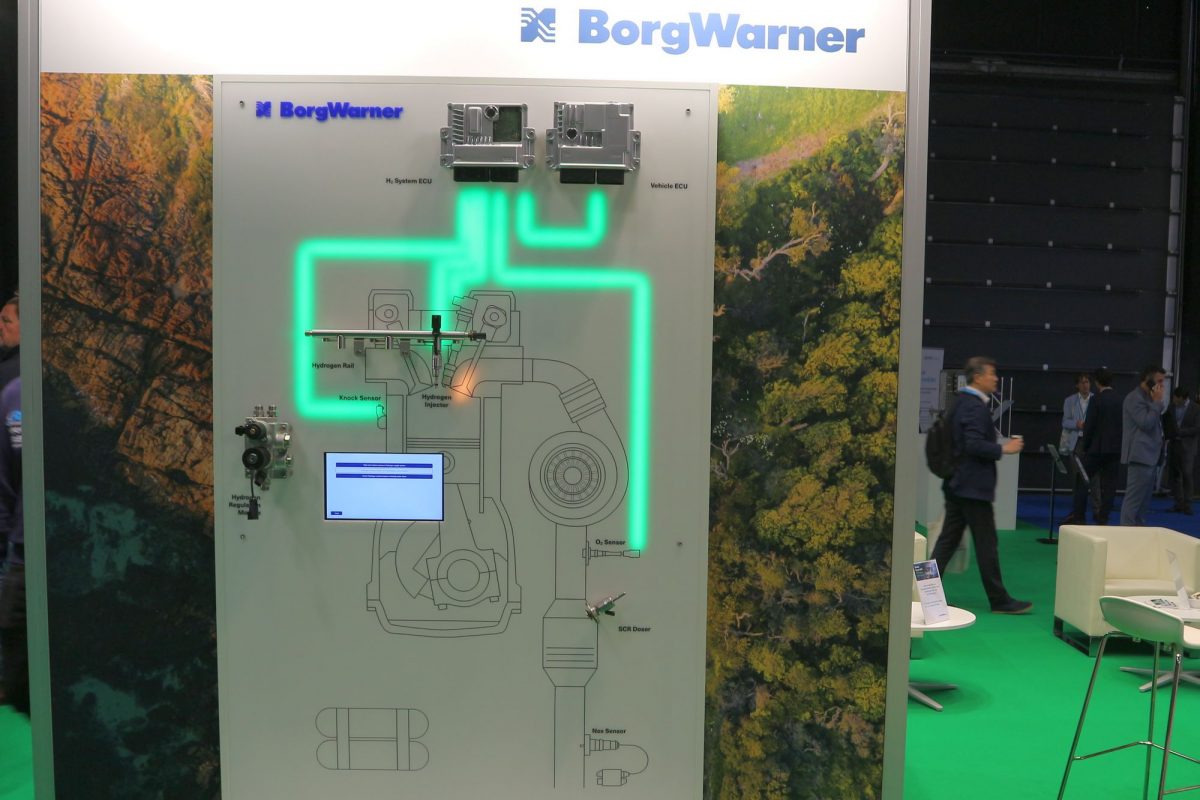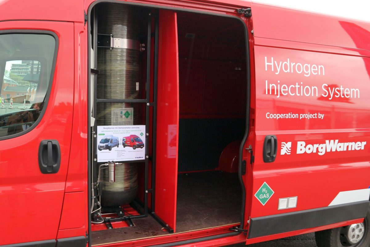 Hidrogénüzemű furgonból kettő is volt kint, az egyikkel még mentem is egy kört! Ez a piros autó volt az, az amerikai BorgWarner autós háttéripari nagyvállalata demonstrációs autója, egy hidrogén-befecskendezésre és szikragyújtásra átalakított egykori dízelmotoros, tehát belsőégésű, csak a hengerekben olajszármazék helyett hidrogént égető jármű: