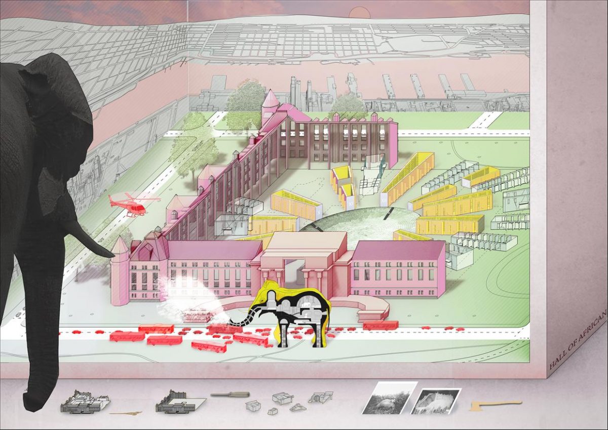 A fent említett pályázatra érkezett egy rövid, játékos,mégis provokatív kísérleti projekt a Design Earth jóvoltából: egy varázslatos realisztikus történet, amelyet spekulatív tervrajzok kísérnek. Az "Elefánt a teremben" lényegében arról szól, hogy mi történne, ha az egyik állat, esetünkben elefánt, életre kelne, és igazságot követelne, ledózerolná a múzeumot, és pontosan annyit hagyna belőle, mit ami a gyarmatosítók után hátramaradt.