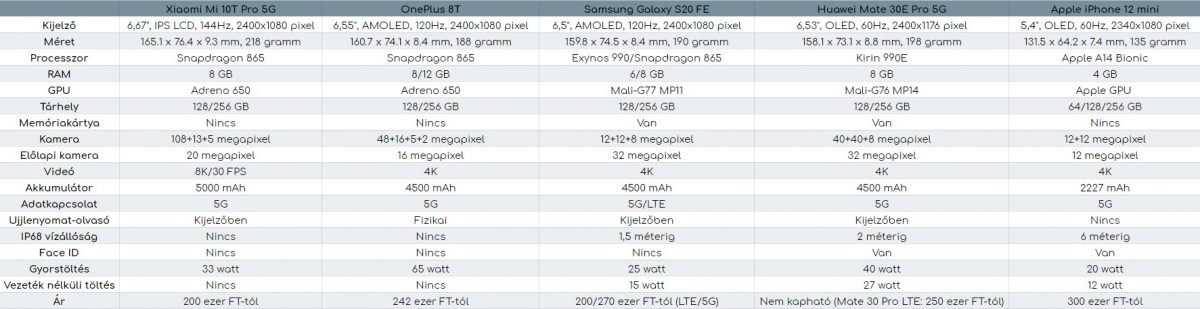 A piac telítődése elsősorban a OnePlusnak jött rosszul, hiszen az ősszel bemutatott OnePlus 8T a 242 ezer forint körüli (667 eurós) árával alig olcsóbb, mint a Samsung Galaxy S20 FE 5G vagy a Magyarországon egyelőre nem kapható Huawei Mate 30e Pro, és az Apple iPhone 12 minijénél sem sokkal, így a kínai gyártó a már megszokott, légüres tér helyett idén egy elég tömött piacon találta magát az új készülékével. A Xiaominak kicsit könnyebb a helyzete, hiszen a Mi 10T Pro árával még mindig sikerült alullicitálniuk az 5G-s konkurenciát, ennek a kisebb, 128 GB tárhellyel szerelt változata jelenleg bolttól függően 190 és 210 ezer forint között kapható. Mivel a két készülék egyszerre volt nálunk tesztelésen, ezért tételesen összehasonlítottuk, hogy melyiknél mit kapunk a pénzünkért.