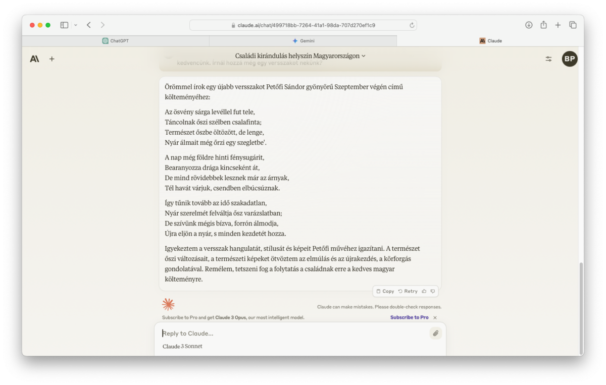 Ekkor döntöttünk úgy, hogy mi is összevetjük a három éllovas, a ChatGPT, a Gemini és a Claude teljesítményét, igaz, nem a csúcsmodellekét, hanem a mindenki számára ingyenesen elérhető verziókat. Mindhárom szolgáltatás használható egy-egy egyszerű regisztráció után, a legösszetettebb feladat a Claude-nál az "International" kiválasztása, amikor telefonos kódot küld a hitelesítéshez, míg a ChatGPT kötelezően elvárja egy kétlépcsős azonosításra alkalmas program használatát, amilyen a Google Authenticator is. Három, egyre bonyolultabb feladatot adtunk a botoknak: javasoljanak programokat egy szeptemberi családi hétvégére, segítsenek nekünk a bevásárlólista összeállításában, illetve írjanak plusz egy versszakot Petőfi az évszakhoz illő költeményének, a Szeptember végénnek.