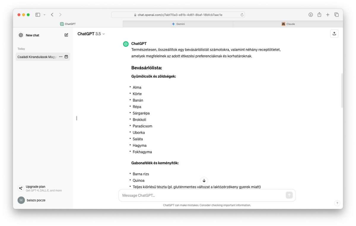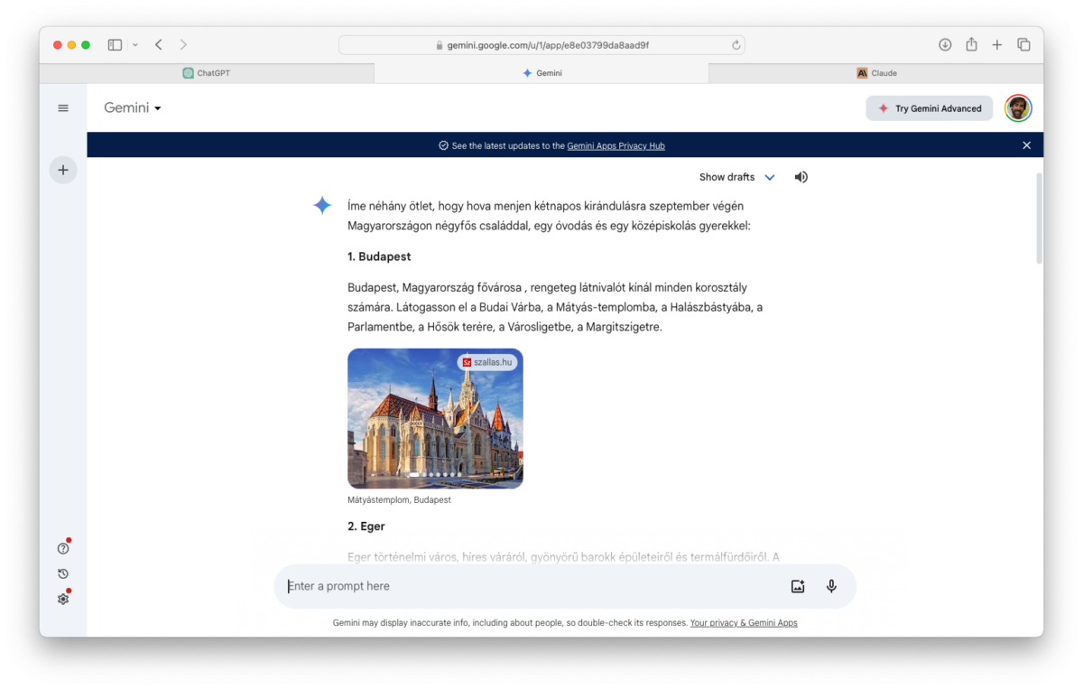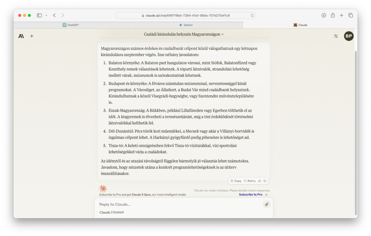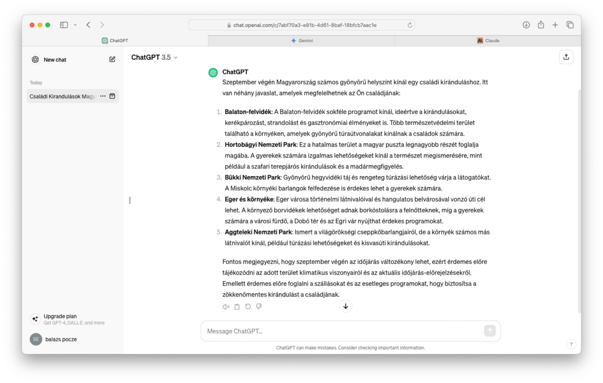 Ez a kérdés egyik versenyzőt sem tudta megizzasztani. Ugyan a ChatGPT a Balaton-felvidék és Eger mellett három nemzeti parkot, a Gemini csak városokat, míg a Claude régiókat ajánlott, de még abban is tökéletesen együtt mozogtak, hogy a válaszuk végén felhívták a figyelmet arra, hogy ügyeljünk az utazási távolságra, az időjárásra, vagy épp az egyes családtagok igényeire. Egyik felvetésük sem lepett meg minket - de hát nem is ezt kértük; azt válaszolták, amit kevés információ alapján bármely, Magyarországon járatos családnak jó szívvel lehet ajánlani. Jöhetett a következő lépés.