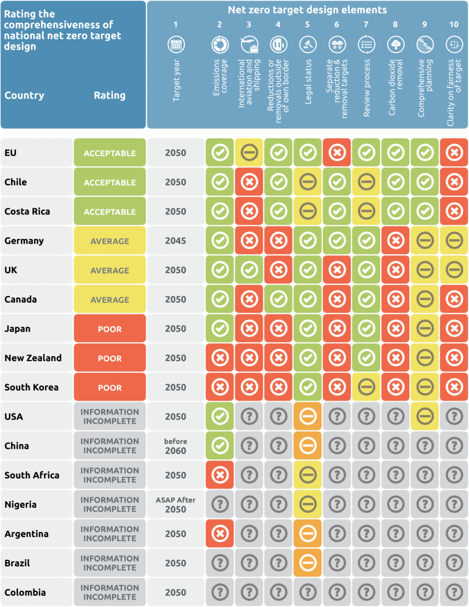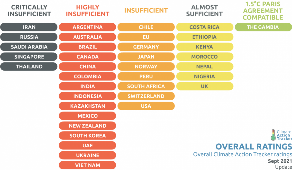 A CAT mérése szerint a legkevesebbet Irán, Oroszország, Thaiföld, Szingapúr és Szaúd-Arábia tette eddig a kibocsátásaik csökkentése és a globális felmelegedés ütemének lassítása érdekében, de stagnál a helyzet, sok más ország mellett, Kínában, Indiában, Brazíliában és Ausztráliában is. A fejlődő országok között az aktívabb és így a vállalásait nagyobb eséllyel megközelítő nemzetek közé tartozik az Egyesült Királyság (az EU hozzá képest némi lemaradásban van), a párizsi egyezménnyel kompatibilis címet viszont egyetlen egy ország kapta meg, mégpedig Gambia.