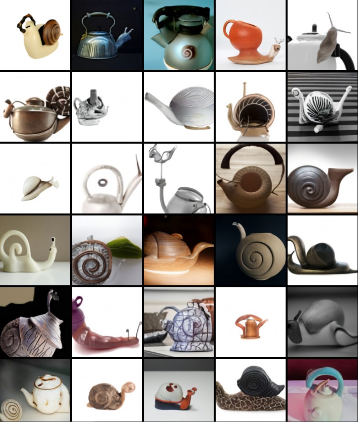 Az igazán érdekes dolgok azonban az egymással nem összefüggő dolgok kombinálása, mint például a teáskanna keverése egy csigával. Ebben az esetben DALL-E igyekszik figyelembe venni a csiga és a kanna alakját is, majd kombinálja a kettőt. Akadnak képek, melyeken a csigaház kanna alakú, más képeken pedig a kannán fut csigavonal. Ugyanakkor, ahogy azt a már linkelt honlapon is írják, az algoritmus néha hibázik, és nem összeolvasztja a képen a két dolgot, hanem egyszerűen csak megjeleníti azokat egymás mellett.