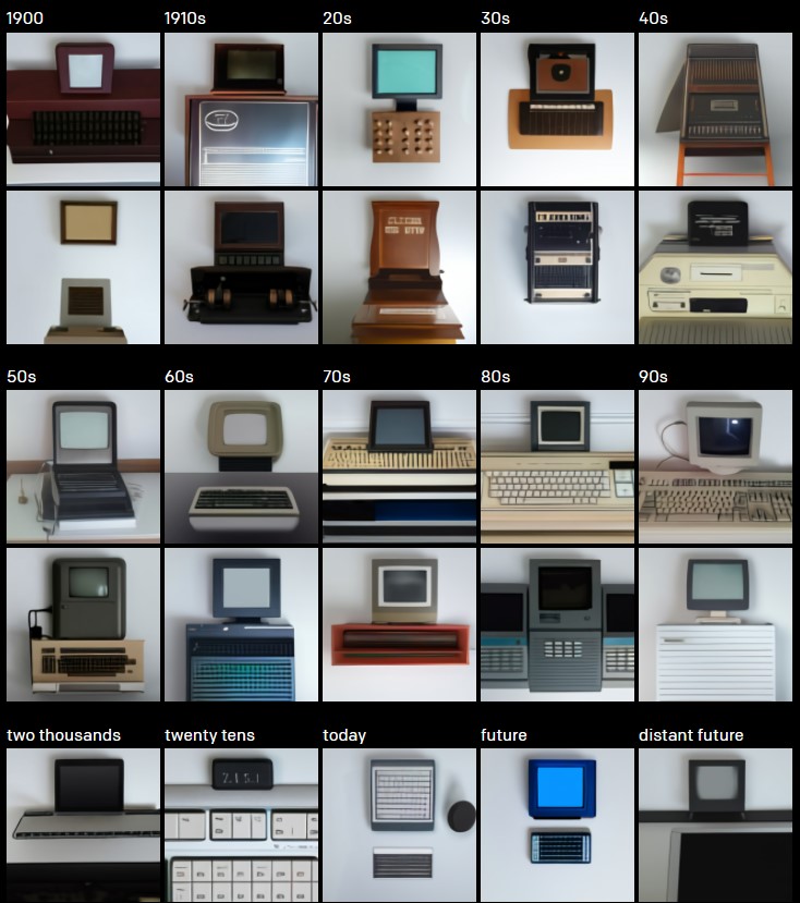 Lenyűgöző az is, ahogy az AI „elképzel” ténylegesen sosem létezett tárgyakat valójában létező tárgyak mintájára és stílusában. Az alábbi képen például a szoftver az általa megtanult, alapvető és sztereotipikus tudást a dizájnban és a technológiában tapasztalható trendekkel kapcsolatban alkalmazta, hogy ábrázolja a számítógép megjelenésének elképzelt fejlődési útját 1900-tól egészen a közeljövőig.