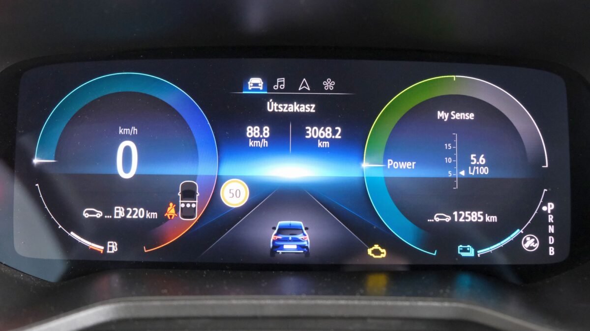 A legörömtelibb dolog, ha egy nap alatt akar hazajönni az ember egy ilyen kocsival (1300 kilométer), az automata erőátvitel komfortja. Nincs kuplungolás, nincs váltás. A tankolásoknál pedig annak lehet örülni, hogy nem kell túlfogyasztással megfizetni a kényelmesebb vezetést. Ahogy a Toyota-féle hibridekben, a Renault E-Techjében sincs csúszással-súrlódással működő kuplung vagy hidrodinamikus nyomatékváltó; az elektromos hajtás segítségével ki lehet iktatni ezeket az energiazabáló hajtási elemeket a rendszerből. 5,6 literes fogyasztás szinte végig autópályán, benne tempósabb, időnként a végsebességet is próbálgató német szakaszokkal: ezt egy automata, benzines kocsival még a a kisautók kategóriájában sem lehetne összehozni hibridtechnika nélkül. Azt pedig, hogy miből is keletkezik a spórolás, maga a Clio mutatja meg a műszerfalon:
