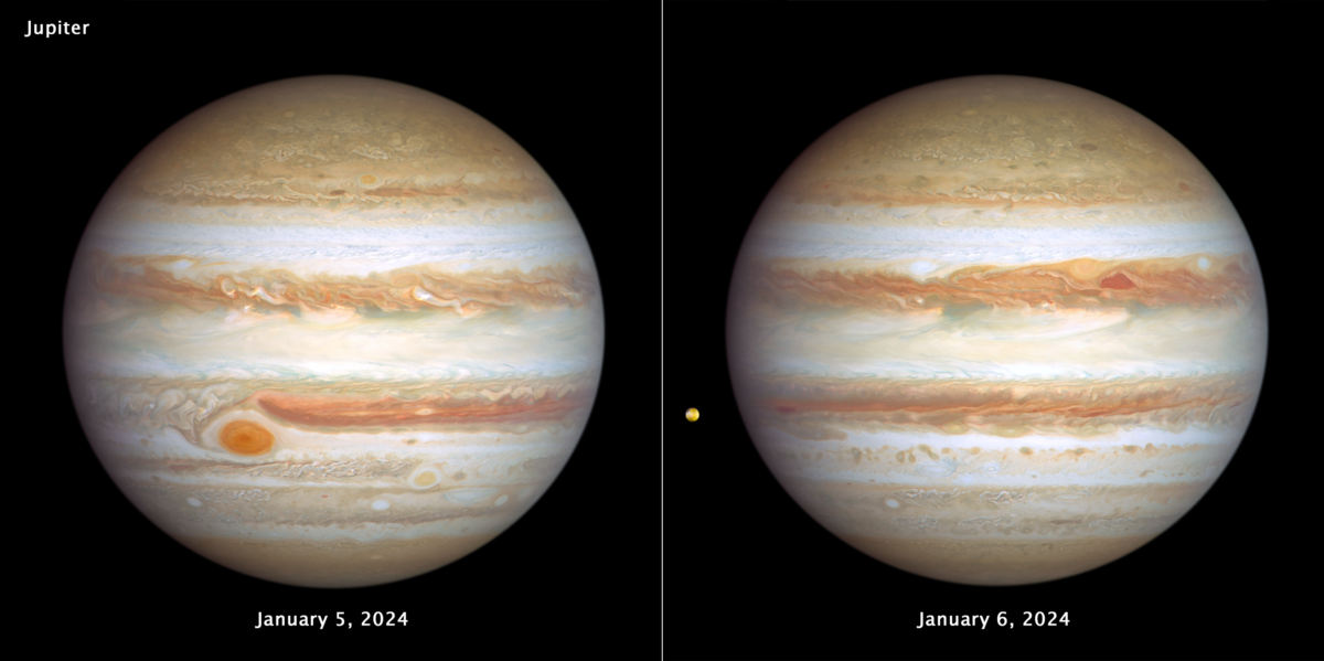 A nagy vörös folt és a kis vörös folt külön utakon járnak, de a saját "sávjukban" maradnak, így általában két évente elhaladnak egymás mellett. A mostani képen egymáshoz viszonylag közel találhatóak. A felvétel felső részén egy másik, szintén vörös anticiklont is sikerült lencsevégre kapnia az űrteleszkópnak.