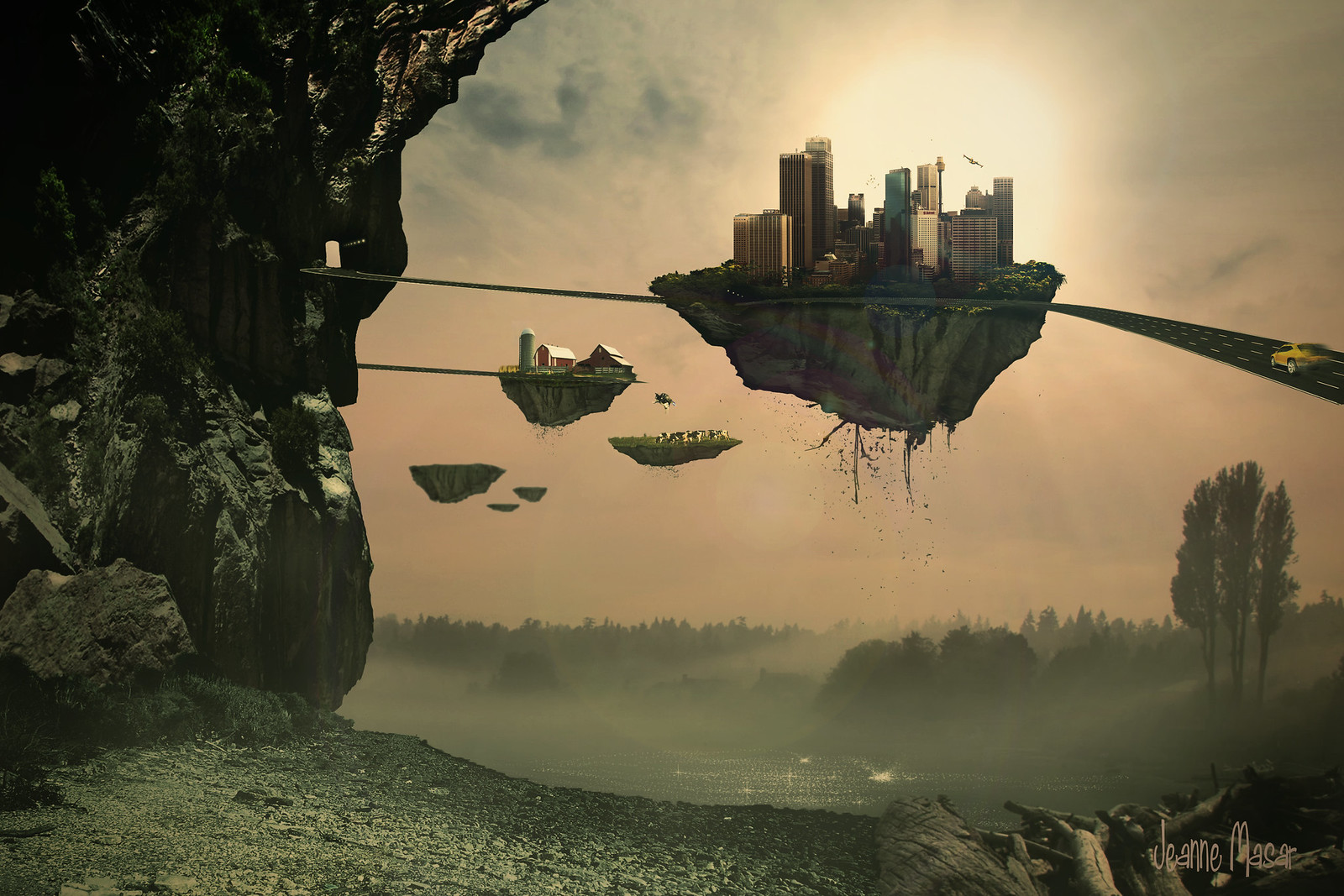 A tervek szerint a legalább hat emeletes, kör alakú lakóépületek egy gyűrű formájú talapzaton helyezkedtek el, melyek egyfajta közösségi térként szolgáltak, ezek a gyűrűk pedig egymástól néhány méterre úsztak a levegőben. Ahhoz, hogy a népesség ki is tudjon lépni a lakásokból és tudjon közlekedni a városon belül, esetleg le tudjon ereszkedni a Földre, mindenkinek biztosítva volt egy Kabin nevű… kabin, amely egy csepp formájú jármű, kényelmes, napozóágyhoz hasonló vezetőüléssel. A bolygó felszíne a felhőkben szálló épületeknek köszönhetően mentesül a mindennapos tevékenységeket szolgáló infrastruktúrák terhétől, de nem mentesül magától az embertől, mivel a Föld így egyfajta ipari, mezőgazdasági, kereskedelmi színtérré alakítható.