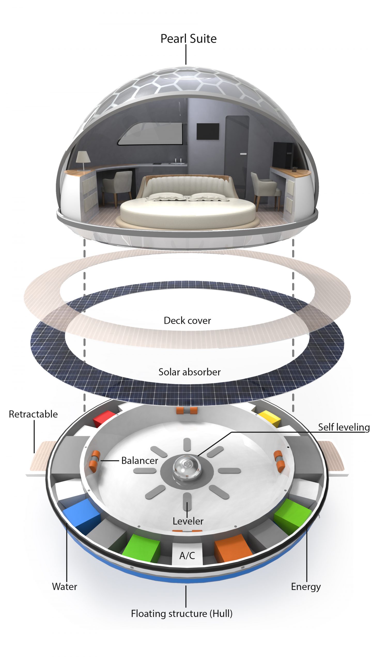A Pearlsuite külső formájában szintén a James Bond film kabinjára hasonlít leginkább, az Anthéneánál kisebb és kompaktabb tér jellemzi, de a 22 négyzetméteres podokban így is megtalálható minden, ami általában egy szállodai szoba berendezését alkotja: nappali, ágy, konyha és mellékhelyiség is tartozik a kabinokhoz. Az elektromos meghajtás 5 csomós, vagyis 9-10 km/h-ás sebességet biztosít a kapszuláknak, így kényelmesen odébb lehet parkolni velük, ha környezetváltozásra vágyik az ember. Az energiaellátást a napelemek fedezik és az egységek kívánság szerint felszerelhetőek a stabilitást biztosító giroszkóppal is. A tervezőiroda a rendeléseket elsősorban a szállodaüzemeltetőktől várja, mivel a podokkal átépítés nélkül, könnyen és egyszerűen lehet bővíteni a szálláshelyek méreteit.