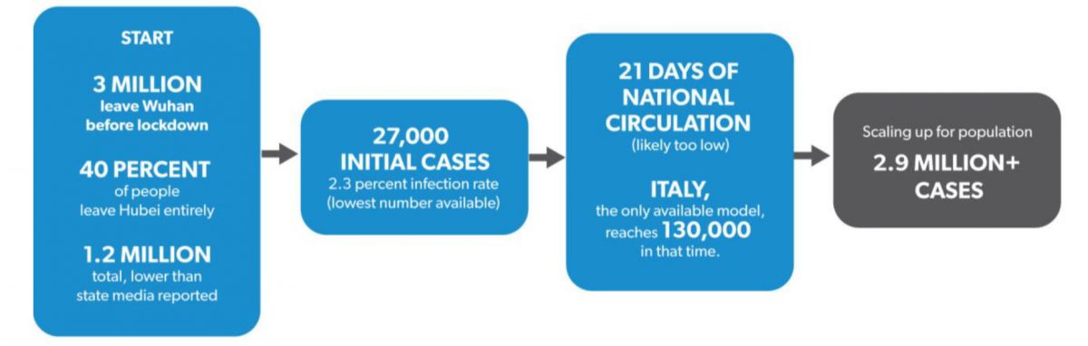 "Január végén a kínai média beszámolt róla, hogy a karantén bejelentése előtt Wuhanból migránsok hullámai vándoroltak el. Még az övéknél is kisebb számokkal dolgozva, - melyek pedig már akkor is alulbecsülték az elvándorlók számát - az országos lezárást megelőző időszak fertőzési rátájának és és fertőzés-terjedési időtartamoknak megfelelően a (jelentősen alul-) becsült esetek száma 2,9 millió lehet."