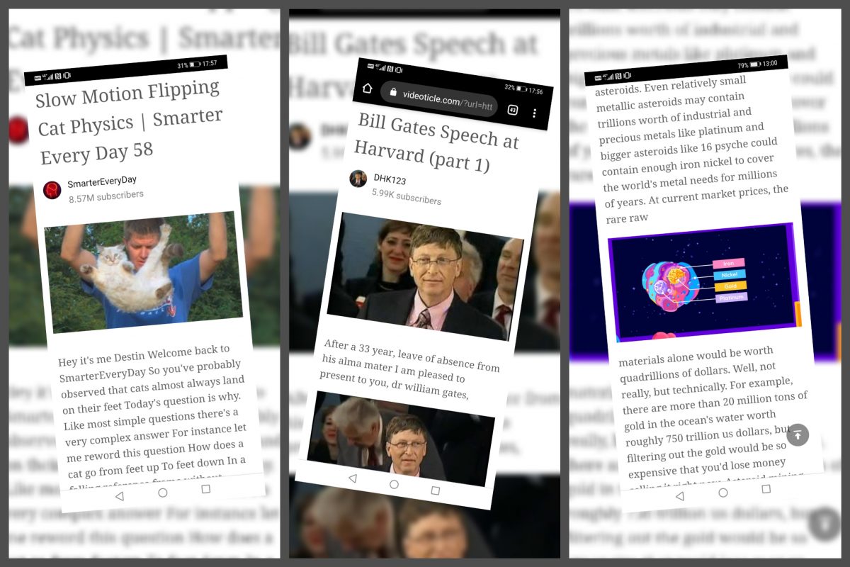 Az első a Smarter Every Day egyik "oknyomozó" videója volt, amiben arra keresték a választ, hogy miért esnek a macskák mindig a talpukra. A videót számos felirattal ellátták, így angol mellett akár arabra, indonézre vagy héberre is fordíthatjuk az átkonvertált cikket, amit utólag a "Tty other format/language" gombbal tudunk beállítani. A Videoticle szépen betördelte a cikket hosszabb bekezdésekbe, legalábbis a hat és fél perces videó második percéig, ahol valamiért elakadt.