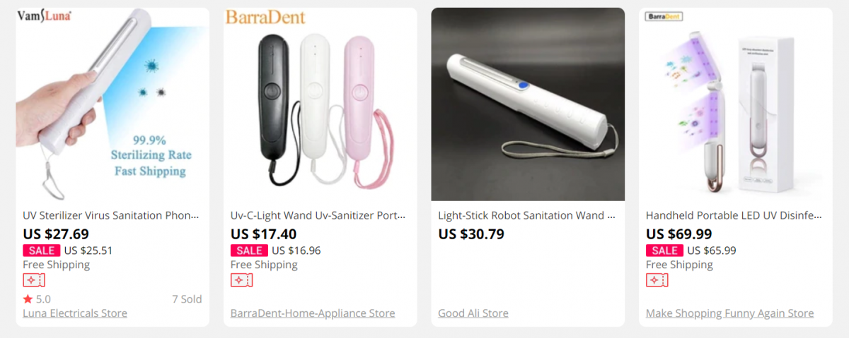 Mindeközben viszont a COVID-19 kapcsán rohamos fejlődésnek indult egy új iparág: az otthoni, háztartási célú UV-C fertőtlenítők gyártása. Egy ilyen készülék olcsón legyártható, a gyártás pedig gyorsan, kis beruházási költséggel beindítható, hiszen nem kell hozzá semmi, csak egy tápegység, egy foglalat meg egy pár dolláros UV-C fényforrás. Az E-Bay, Amazon, Aliexpress és a hasonló nemzetközi online áruházak kínálatában hemzsegnek, de már a magyar oldalakon is megjelentek a különböző méretű és árú készülékek, az USB-ről tölthető, pár ezer forintos UV-C lámpától a több tízezer forintos "UVC-wand"-okig.