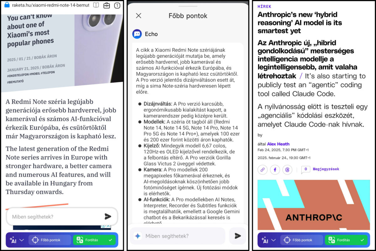 A Xiaomi saját MI böngészője is kapott néhány AI funkciót, amelyek a Google Gemini képességeire támaszkodnak. Ezek segítségével összefoglalhatjuk az oldalak tartalmát valamint le is fordíthatjuk azokat bármilyen nyelvre, így többek között magyarra és magyarról is. Kifejezetten jó ötlet, hogy a lefordított szöveg nem az eredeti helyett jelenik meg, hanem azután, a betűtípus pedig mindig az adott oldal dizájnjához igazodik.