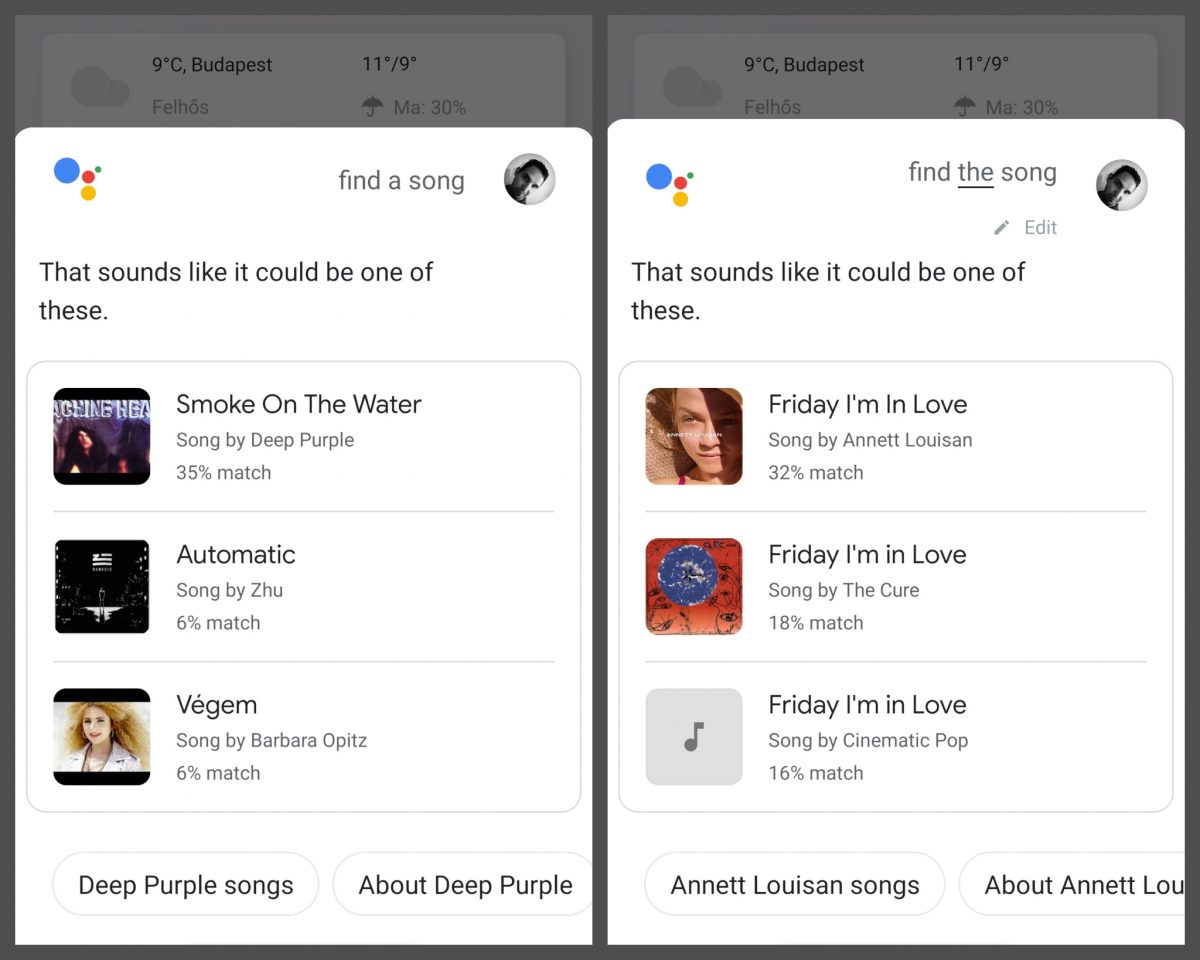 Ha a Google Asszisztensből indítjuk el, a dallamkereső több zenét is feldob a lehetséges jelöltek között, és százalékkal jelzi, hogy mekkora a hasonlóság ahhoz képest, amit dúdoltunk, ezekre rákattintva pedig azonnal rá is kereshetünk a számra a Google keresőben.